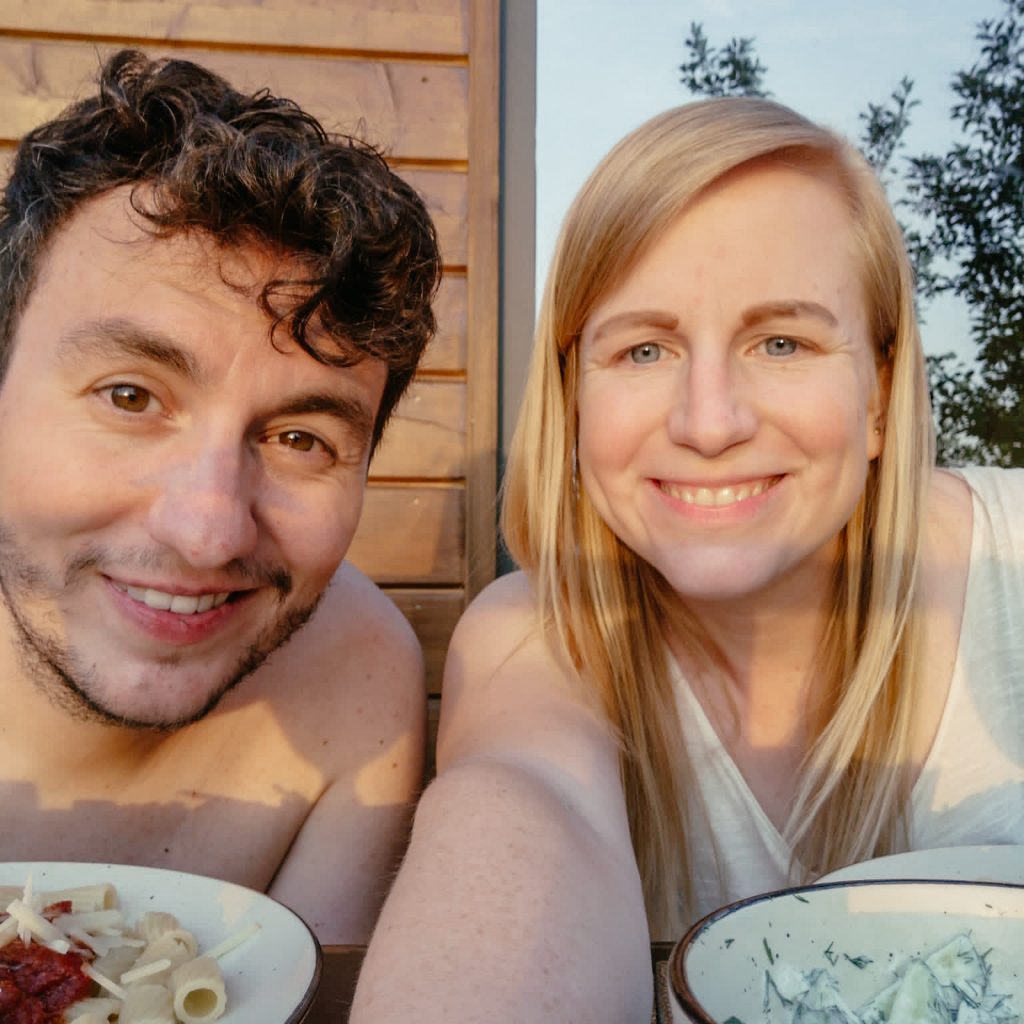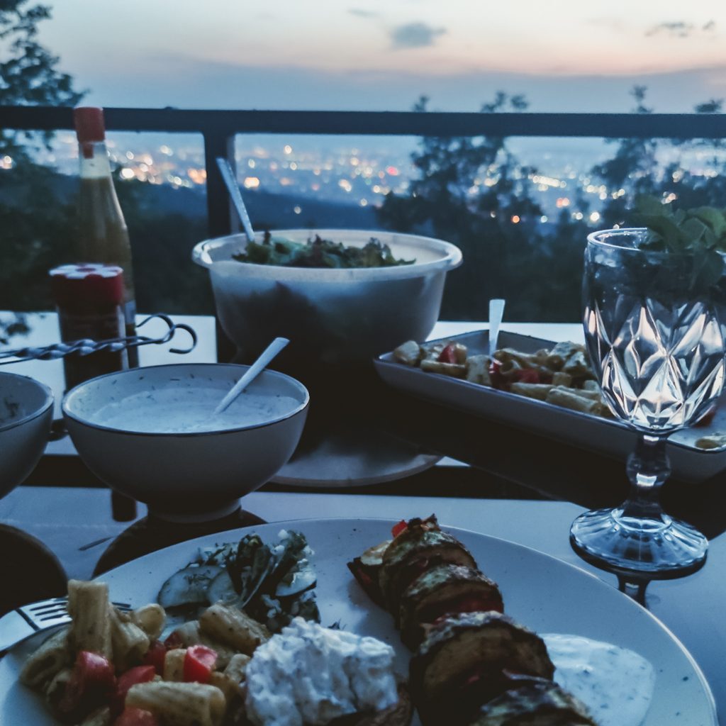 Am Abend kochen wir uns Pasta mit Aubergine-Tomatensauce und genießen das Abendessen auf dem Balkon. Den Parmesan haben wir uns auch ausnahmsweise gegönnt und er schmeckt köstlich! Lustigerweise stellen sich die Dosentomaten als Tomatenmark heraus, einkaufen ist halt doch nicht so einfach.
