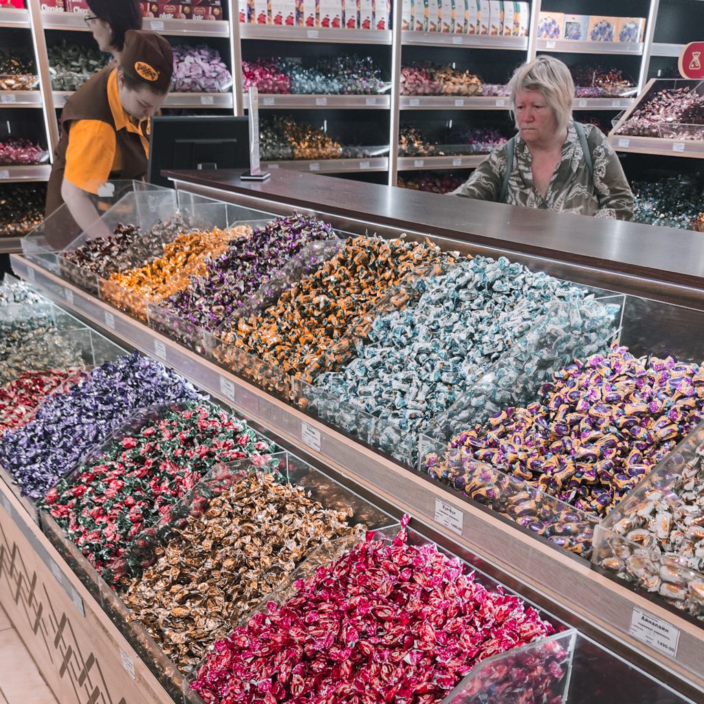 Wir schlendern durch den Shop, beobachten, was bei den älteren Damen (davon sind hier einige unterwegs) beliebt ist und nehmen uns natürlich auch etwas zum Verkosten mit.