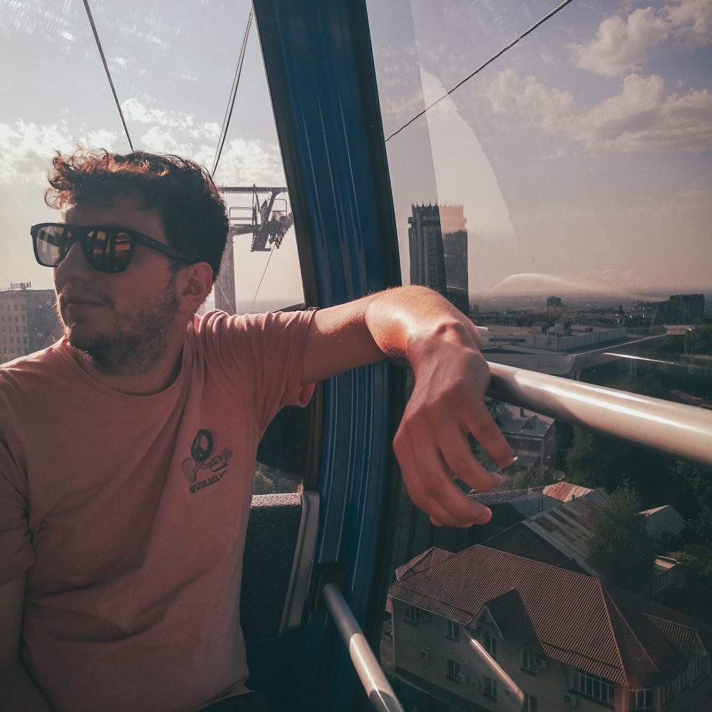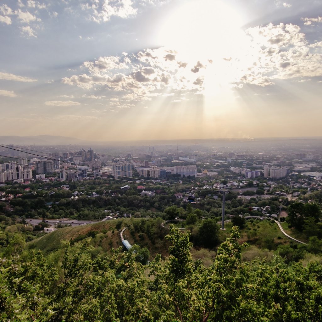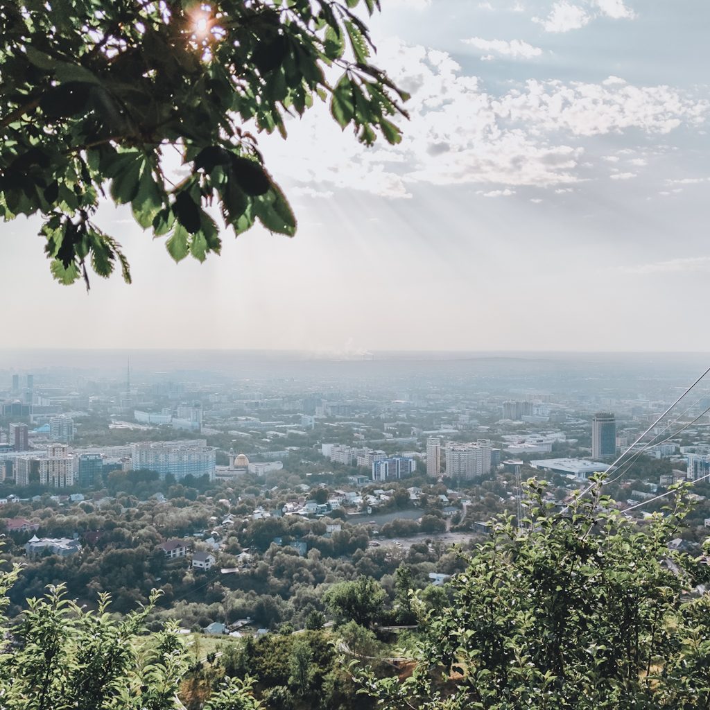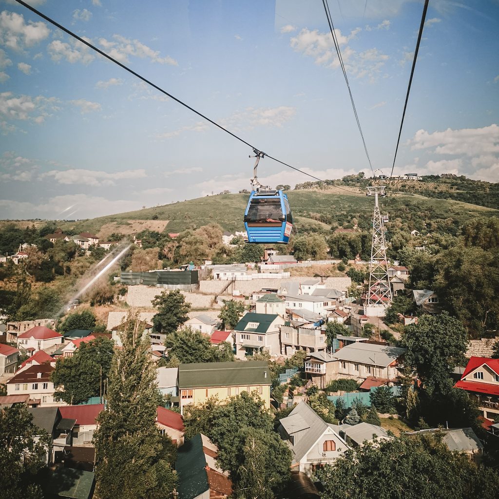 Auf zum nächsten Programmpunkt. Aus der Stadt fährt eine Gondel hoch zum Kok Tobe Hügel (1130 m), von hier aus hat man einen schönen Blick auf die Stadt. Das Ticket ist zwar nicht ganz günstig, aber wir entscheiden uns dennoch für die Fahrt mit der Gondel. Die ist auch wirklich ganz schön, wenn auch etwas kurz. Oben angekommen sind wir allerdings etwas schockiert. Hinter uns befindet sich zwar ein schöner Ausblick auf die Stadt, aber vor uns liegt nicht etwas die Aussicht auf die schönen Berge rund um Almaty, sondern eher ein Kinder Freizeitpark. Fotografen lauern auf Tourist:innen, um Fotos und/oder ein Shooting zu verkaufen. Links steht ein Riesenrad, daneben läuft Kinder Entertainment auf großer Leinwand. Wenn man sich zwischen Kinder Elektroautos durch manövriert hat, stehen einem zahlreiche Souvenirshops bevor. By the way hatte keiner der Shops Postkarten,aber dazu später mehr. Was es noch gab? Ein Gruselkabinett, VR Brillen, eine kleine Achterbahn und eine Art Streichelzoo. Wir können nicht fassen, dass damit die Sicht auf die Berge verbaut wurde. Was Caro zu dem Zeitpunkt noch nicht weiß – uns erwartet in zwei Tagen eine tausend Mal schönere Aussicht auf die Stadt und die Berge. Wir machen noch ein paar Fotos vom Ausblick auf die Stadt und dann geht’s wieder unter mit der Gondel.