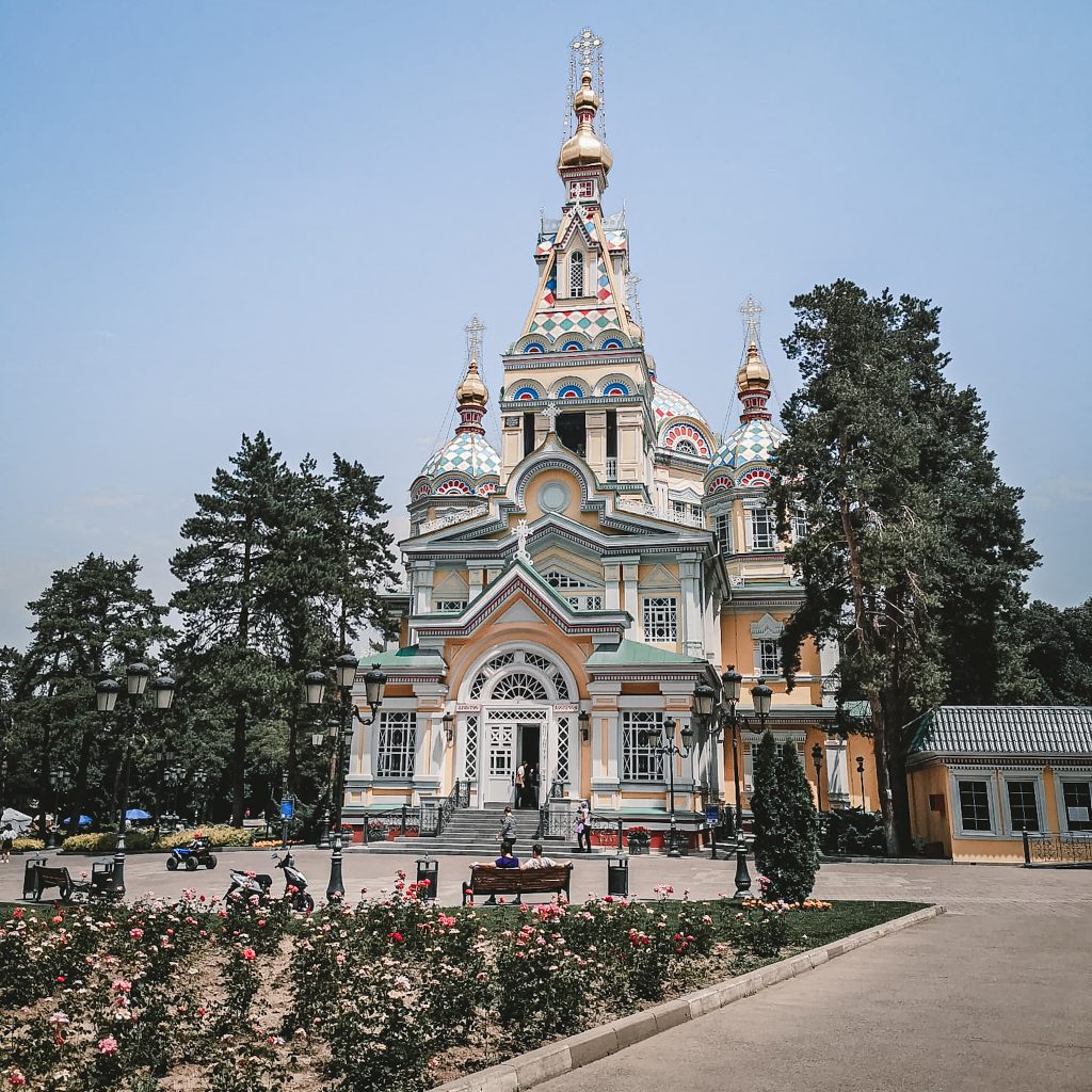 So kommt uns der Park der 28 Panfilowzy im Zentrum auf jeden Fall vor. Hier stehen viele große alte Bäume, die viel Schatten spenden. Ein kleines grünes Paradies in der Stadt. Und mittendrin die Christi Himmelfahrt Kathedrale. Sie ist eine russisch orthodoxe Kirche, die 1907 fertiggestellt wurde und heute das Wahrzeichen von Almaty ist. Mit 46 Metern ist sie die höchste, aus Holz erbaute russisch-orthodoxe Kirche der Welt.