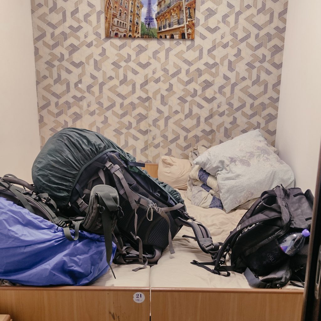 Preislich sind wir bei der Buchung von Unterkünften in den letzten Wochen etwas verwöhnt. Oft hatten wir ein Doppelzimmer mit eigenem Bad für unter 15 Euro pro Nacht und oftmals waren die Doppelzimmer im Homestays günstiger als zwei einzelne Schlafzimmer im Hostel. Wir entscheiden uns für Almaty für ein „Doppelzimmer“ mit Bad und WC zum Teilen im LavHostel (nicht zu verwechseln mit LoveHostel). Wir informieren die Unterkunft extra vorab, dass wir früh einchecken, weil unser Flug früh landet. Dennoch sind wir überrascht, als die Tür zum Hostel offen steht. Mittlerweile ist es ca. 6.30 Uhr. Aaaaber das LavHostel wäre nicht das LavHostel, wenn nicht hinter jeder Tür eine kleine Überraschung steckt. Beim Eintreten laufen wir geradewegs auf ein Bett zu, in dem eine ältere Frau tief und fest schlummert. Konsti räuspert sich vorsichtig und reißt die gute Dame damit wahrscheinlich aus ihren schönsten Träumen. Jedenfalls ist sie danach (verständlicher Weise) nicht bei bester Laune. Englisch? Fehlanzeige. Die folgende Konversation erfolgt eher mit Händen und Füßen. Wichtig ist natürlich, dass wir erstmal zahlen, in bar. Den gesamten Betrag. Logisch, wir haben ja noch nicht mal unser Zimmer gesehen. Vielleicht hätten wir es uns dann ja nochmal anders überlegt. Wobei, zugegebenermaßen wollten wir einfach nur ins Bett. Und wenn es eine Sache in diesem Zimmer gab, dann war es literally ein Bett. Die nette Dame vom Hostel, nennen wir sie mal Xeniya, kramt über ihrem Bett noch Bettwäsche heraus und nimmt uns dann mit auf die Reise in unser Zimmer. Wir befinden uns schon im UG, der Weg bahnt sich durch einen Flur und wir entfernen uns immer weiter von der einzigen Tageslichtquelle des Hostels – der Eingangstüre. Im Flur stehen einige Zimmertüren offen, was sich dahinter befindet: Männer in Unterhosen, mal wach, mal schlafend in Doppelstockbetten. Dann sind wir auch schon fast angekommen, bei unserer liebevoll betitelten Isolationszelle für die kommenden drei Nächte in Almaty. Fangen wir damit an, was das Zimmer zu bieten hat: ein Doppelbett, eine Milchglastür und ein Nachtischschrank. Nicht zu vergessen, ein Bild vom Eiffelturm an der Wand. Was das Zimmer nicht hat? Vor allen Dingen Platz. Der Raum ist so breit wie das Bett, davor steht noch der Nachttischschrank und dann ist auch schon Schluss. Wenn wir unsere Rucksäcke hinstellen, können wir noch so gerade daneben stehen.