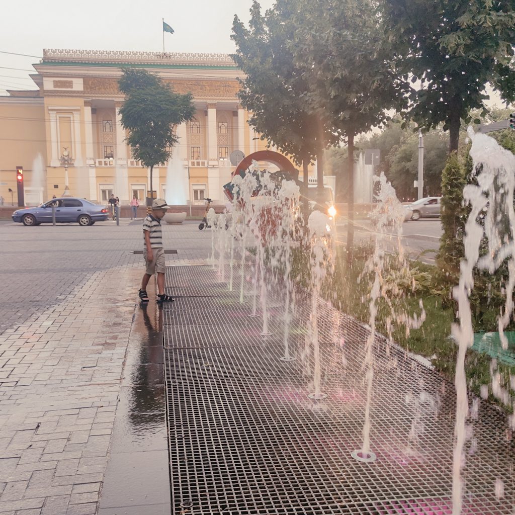 Wir sind etwas außerhalb der Stadt und machen uns zu Fuß auf den Weg ins Zentrum, um ein bisschen was zu sehen. Caro ist nach dem Antibiotikum leider sehr kaputt und müde. Zurück in die Isolationszelle für ein Nickerchen? Das klingt weniger einladend und so lassen wir uns in einem Park nieder, wo Caro ein Schläfchen auf der Parkbank macht. Konsti beobachtet das Treiben und recherchiert schonmal eine mögliche Abendlocation. Er wird fündig und nach dem Nickerchen begeben wir uns zum Italiener. Wir sind begeistert. Wir sitzen draußen an Tischen mit weiß-rot karierten Tischdecken, die Atmosphäre ist entspannt und wir können das Treiben auf der Straße beobachten. Wir teilen uns eine Pizza Margherita und einen Ceasar Salad. Wir sind zugegebenermaßen im 7. Himmel. Danach schlendern wir durch die Fußgängerzone nach Hause. Es ist warm und viele Leute sind noch auf der Straße unterwegs. Sie sitzen in Cafés, Restaurants oder auf einen von vielen Straßenbänken. Es spielen zahlreiche Straßenmusiker, von moderner Geigenmusik, regionaler „Volksmusik“ bis zum Gesang. Hier ist alles dabei. Die Kinder spielen an zahlreichen Brunnen und Kunstinstallationen, es ist noch richtig etwas los. Das gefällt uns sehr gut. Wir hätten ehrlicher Weise gar nicht damit gerechnet, dass hier alles so modern und für uns „westlich“ erscheint. Ein kleines bisschen kommen Europa-Vibes auf.