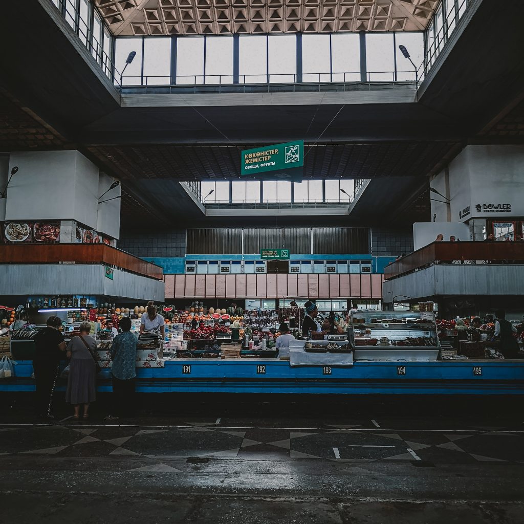 Nicht weit entfernt liegt der Green Bazar. Im dem von außen etwas trist wirkenden Gebäude, wird im Inneren reger Handel betrieben. Hier gibt es alles, was das kasachische Herz begehrt. Zahlreiche Stände mit getrockneten Früchten, Nüssen, lautstarke Obst- und Gemüsehändler, die frisch gepresste Säfte anbieten, Molkeprodukte und natürlich Fleisch. Davon ist die Hälfte der Halle gefüllt und wir machen einen großen Bogen darum. Dafür schauen wir uns die vielen kleinen „Kurts“ in allen Formen und Farben an. Die getrockneten Quark Kugeln sind geschmacklich allerdings etwas gewöhnungsbedürftig, die Kasachen hingegen lieben sie. Caro würde am liebsten ein riesen Glas Honig erstehen, aber Konsti hält sie erfolgreich von zusätzlichem Reisegepäck ab.
