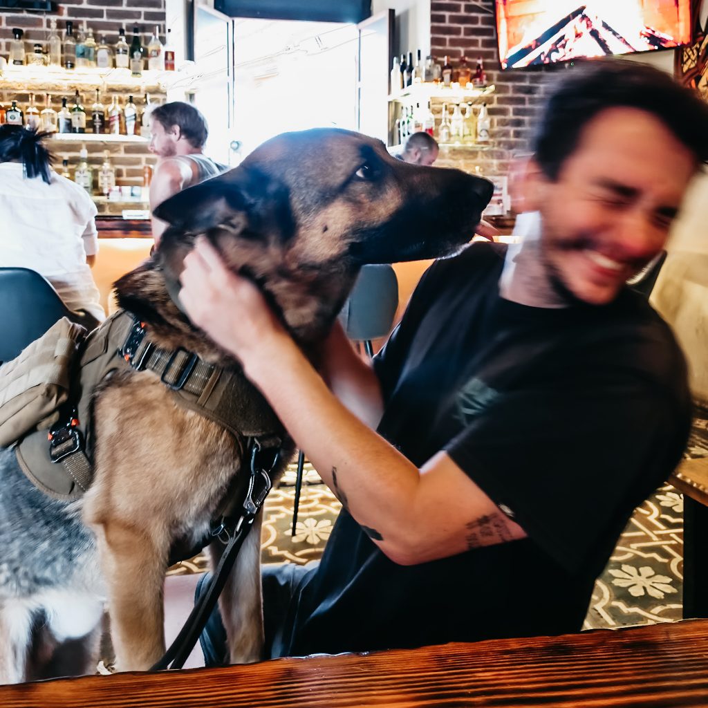 Aber irgendwann müssen wir den Absprung schaffen. Wir eisen uns los, um drei Geschäfte weiter noch die Bier-Happyhour mit zu nehmen. In der dänischen Bar „Skol“, die uns beim ersten Mal schon positiv aufgefallen ist, sieht es ähnlich aus. Es ist nicht viel los, aber ein paar Expats sitzen an der Bar und genehmigen sich einen Drink. In bester Begleitung eines riesigen Schäferhundes, der Konsti schwanzwedelnd begrüßt. Da dies mit Begeisterung und einer Streicheleinheit erwidert wird, beginnt eine kleine Liebesgeschichte. Der Schäferhund sieht zwar etwas gefährlich aus (vielleicht wegen seinem camouflagefarbenen Geschirr, ist aber der größte Schmusehund. Diesem Ankuschelversuch kommt Konsti entgegen und verwöhnt ihn mit einer großen Kuscheleinheit. Das begeistert ihn so sehr, dass er mit den Vorderpfoten auf die Bank kommt und Konsti ein Küsschen geben will. Süß. Wirklich zuckersüß. In so netter Gesellschaft muss man doch ein Bier trinken. Danach geht es für uns aber wirklich nach Hause, denn um 19 Uhr steht das Essen ja schon wieder auf dem Tisch.