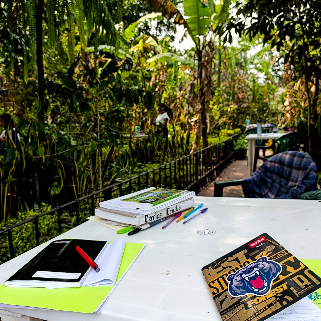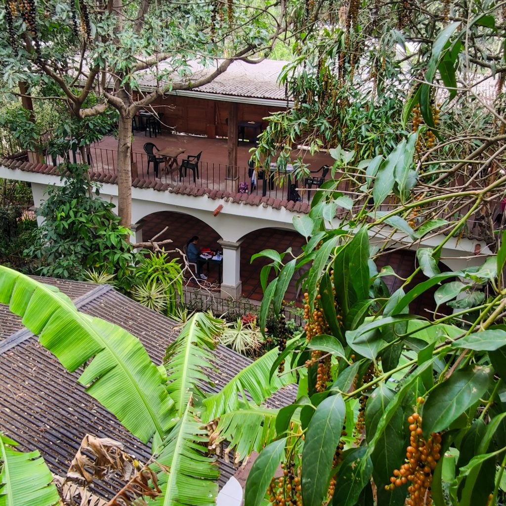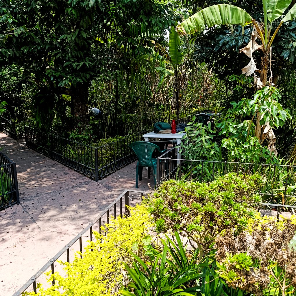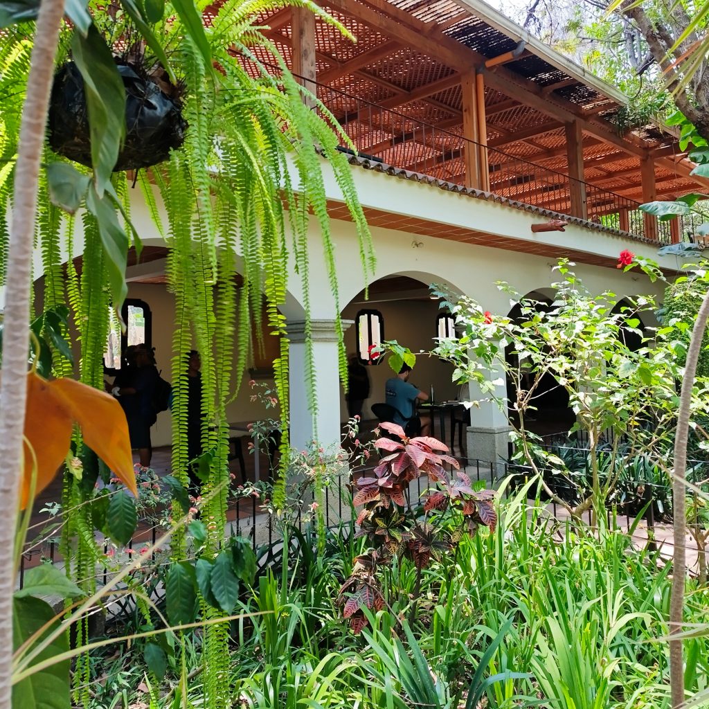 Carlos begrüßt uns sehr nett und höflich und ehe wir uns versehen, machen wir uns schon auf den Weg in den Garten. In den Garten? Genau. Die Spanischstunden unserer Sprachschule finden alle in einem großen Garten oder vielmehr in einer Eventlocation statt. Während hier am Wochenende oder am Abend Events wie Konzerte, Kulturveranstaltungen und Hochzeiten stattfinden, dürfen tagsüber die Schüler:innen hier pauken. Der Garten liegt am Rand der Innenstadt. Hinter einem großen Tor erstreckt sich ein großes Gelände. Überall verteilt stehen kleine Tische mit zwei bis drei Stühlen. Hier findet der Unterricht, entweder 1:1 oder 2:1 mit den Lehrkräften statt. Es ist wunderschön. Nachdem wir auf dem Weg zum Garten schon ein bisschen auf Spanisch geplaudert haben (wir vermuten, Carlos wollte dadurch unser Niveau testen), führt Carlos uns nach Ankunft im Garten herum.