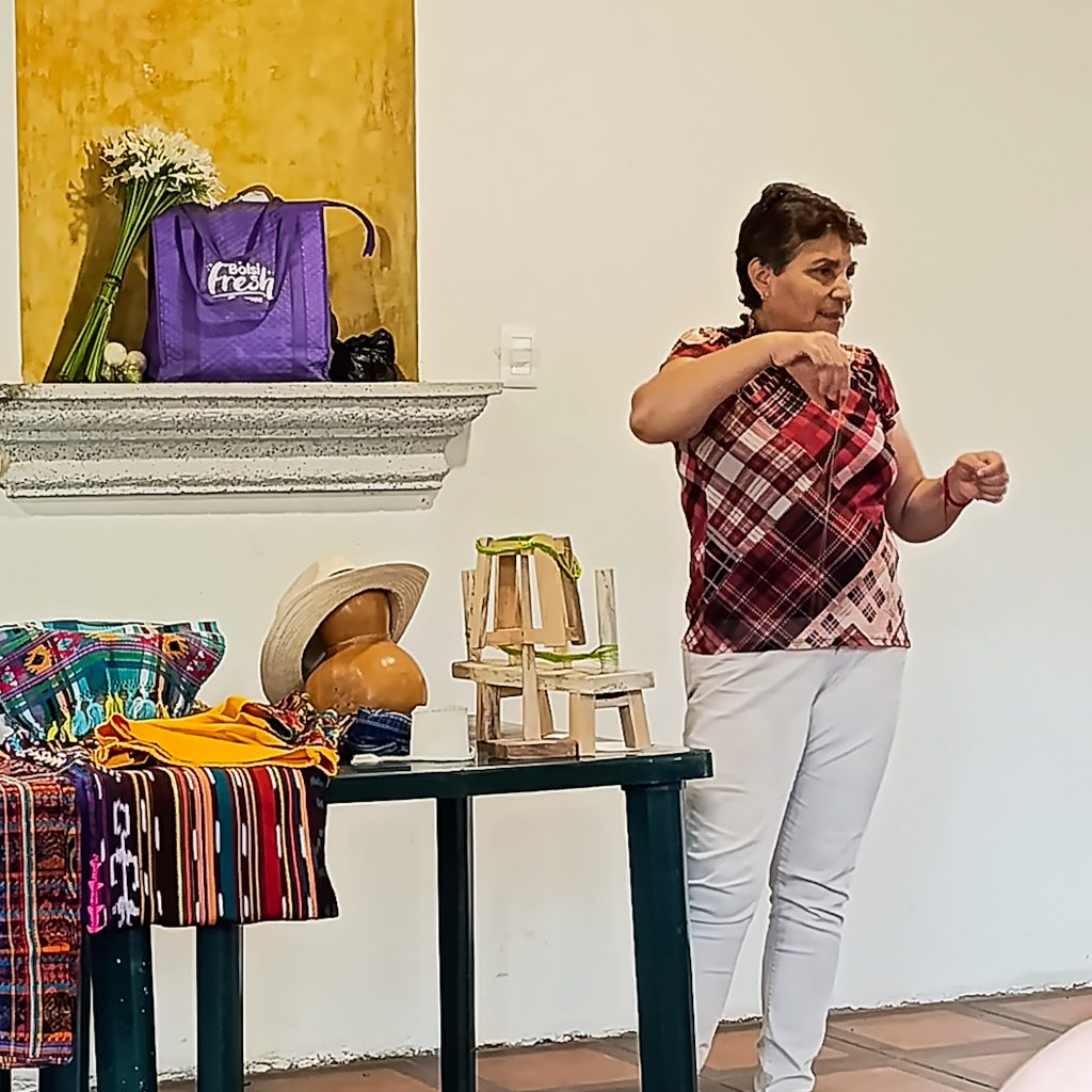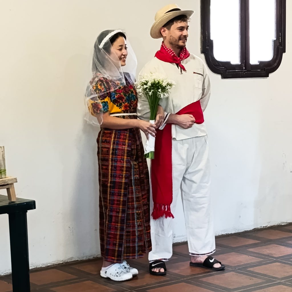 Aber wir verbringen natürlich nicht jeden Nachmittag in unserem „Stamm-Café“. Einen Nachmittag in der Woche bietet unsere Sprachschule eine Art Kulturprogramm an. Manchmal werden Ausflüge gemacht und manchmal finden kleine Veranstaltungen in der Schule bzw. dem Garten selbst statt. So auch heute. Das Thema lautet: Hochzeiten. Es geht dabei um die Vermittlung von lokalen Traditionen, insbesondere der indigenen Bevölkerung und natürlich um Spanisch. Die Teilnahme ist freiwillig, aber das lassen wir uns natürlich nicht entgehen. Vor allem weil Carlos uns angepriesen hat, dass es die typische Hochzeitssuppe zum Verköstigen geben wird. Sogar in vegetarischer Variante. Nachdem wir uns um das Abschiedsgeschenk für Carlos gekümmert haben (ein Sherlock Holmes-Roman, da Carlos gerne liest, aber er selten Bücher kaufen kann), finden wir uns heute also auch am Nachmittag in der Schule ein. Es sind ein paar Stuhlreihen aufgebaut und davor ein großer Tisch mit lauter Kleinigkeiten. Eine Lehrerin der Schule führt durch das Programm. Sie erklärt uns in den folgenden 1,5 Stunden viel zu den Traditionen der Hochzeit und vor allem zur Rollenverteilung, die, wie sollen wir sagen, doch noch sehr traditionell ist. Es wird früh geheiratet und selbstverständlich fragt der Mann die Frau. Nach dem Antrag findet ungefähr ein Jahr später die Hochzeit statt. Genau ausreichend Zeit, damit die Frau ihr Outfit selbst weben und schneidern kann. Vorausgesetzt sie verbringt keine Zeit mehr mit Freundinnen oder der Familie. Dafür hat sie aber auch ein tolles und selbstgemachtes Hochzeitsoutfit. Die Farben und Muster der Güipiles unterscheiden sich je nach indigener Gruppe, hier gibt es festgelegte Muster (bspw. spezielle Blumenmuster), die für eine bestimmte Gruppe stehen. Die Lehrerin hat ein paar Kleidungsstücke mitgebracht und sogar zwei Freiwillige gefunden, die sich opfern und kurzerhand vor den Traualtar gebracht werden.