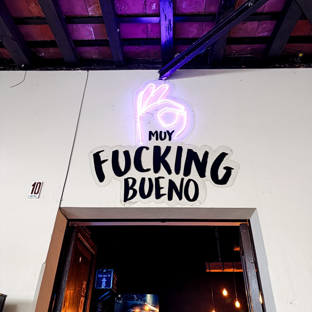 Nach unserer erfolgreichen Unterrichtswoche sind wir ein kleines bisschen stolz auf unsere eingeschobene Schulzeit. Wir haben wirklich viel gelernt und sind Carlos sehr sehr dankbar für seine tollen Unterrichtsstunden. Es hat super viel Spaß gemacht und zu gerne hätten wir noch mindestens eine Woche dran gehängt. Unsere Zeit hier möchten wir in Erinnerung behalten und beschließen daher, nicht nur mit einem Bier anzustoßen, sondern auch ein kleines Souvenir in Form eines T-Shirts zu kaufen. Es geht in den „Muy fuckin bueno“ Laden. Da es selbstverständlich nicht in Frage kommt, dass wir uns das gleiche T-Shirt kaufen, probieren wir ein bisschen herum und suchen uns schließlich zwei Varianten aus. Weiß kommt dabei natürlich nicht in Frage, damit haben wir in den letzten Monaten nicht die besten Erfahrungen gemacht. Beim Kauf von zwei T-Shirts bekommt man zwei Bier oder zwei Wein gratis. Ob uns das vielleicht auch ein kleines bisschen zum Kauf motiviert hat? Ein klitzekleines bisschen vielleicht.