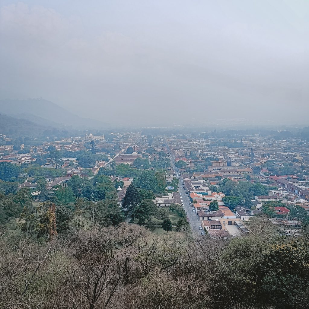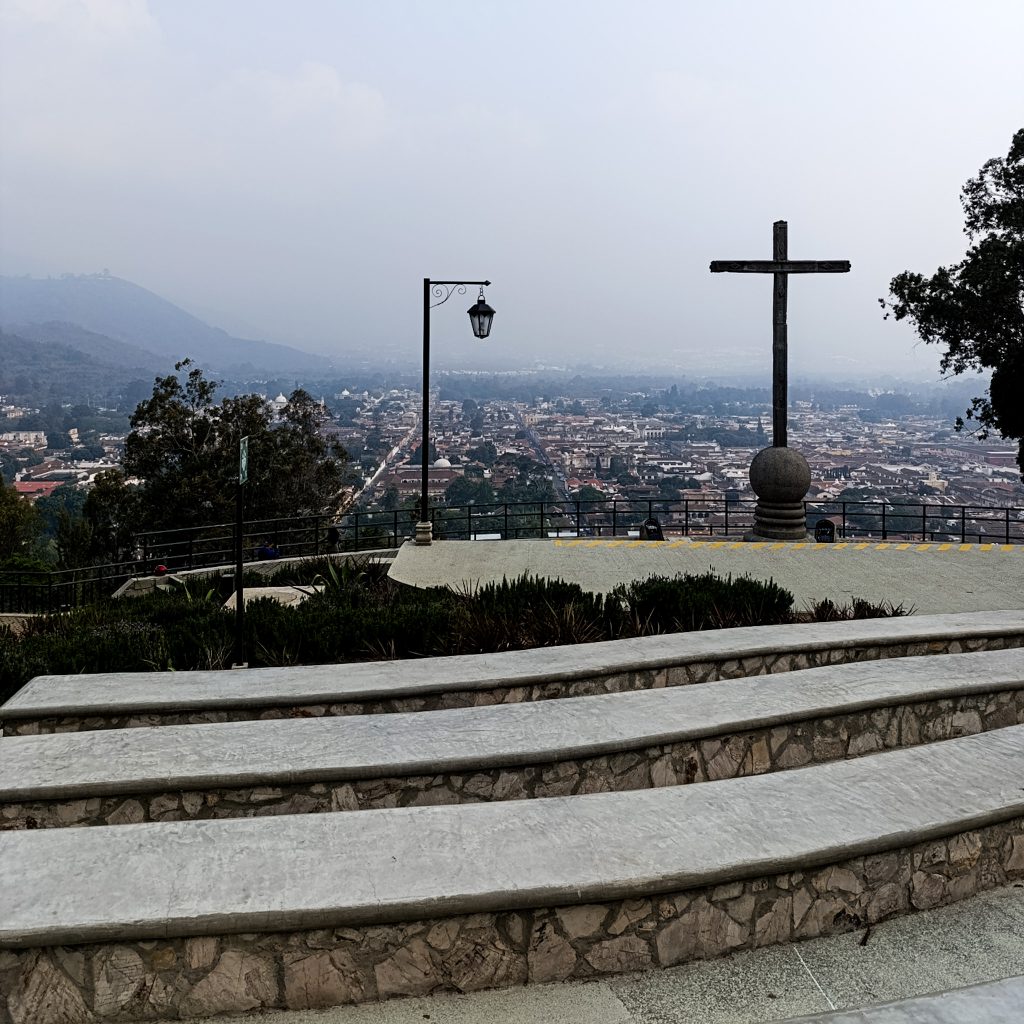 Wir wollen uns natürlich auch ein bisschen was von Antigua anschauen. Obwohl wir schon ein paar Tage hier sind, haben wir uns eher mit Scheuklappen vor den Augen durch die Stadt bewegt. Das möchten wir ändern. Wir starten einen Ausflug zum „Cerro de la Cruz“, einem kleinen Berg in der Nähe des Zentrums. Der Name kommt, wer hätte es ahnen können, von einem Kreuz, das die Stadt bewachen soll. Bei gutem Wetter soll die Aussicht wunderschön sein. Naja, mal wieder ist es bewölkt und diesig. Wir sehen zwar das Kreuz und den Ausblick auf die Stadt, aber die Vulkane, die die Szenerie im Hintergrund abrunden sollen, lassen sich nicht blicken. Obwohl der Weg nicht weit ist, ist es trotzdem sehr warm und anstrengend, der Muskelkater vom Wochenende plagt uns noch immer. Für den Weg nach oben nehmen wir einen kleinen Trampelpfad, der fast direkt an Claudias Haus beginnt, auf dem Rückweg nehmen wir einen alternativen ausgebauten Weg, der uns in einen bisher noch unbekannten Teil der Stadt führt.