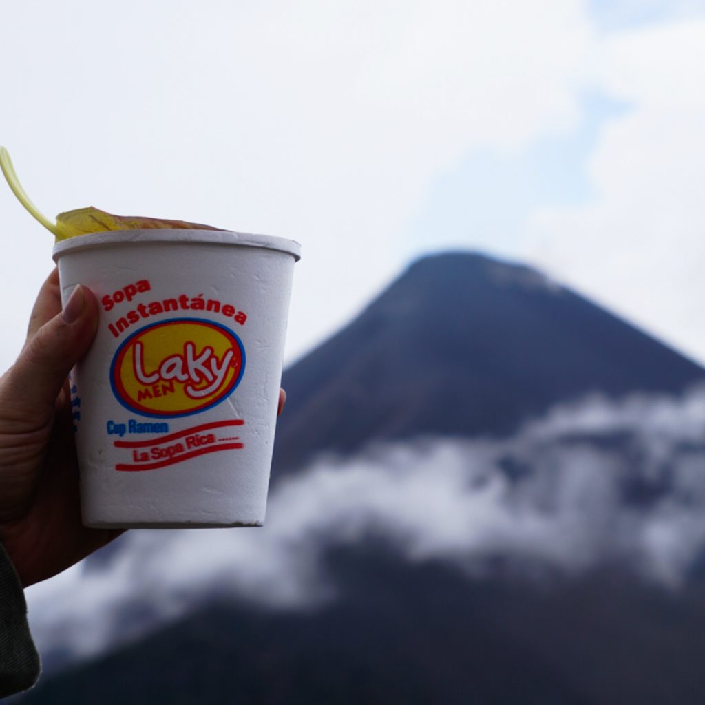 Als alle angekommen sind, stehen wieder ein paar organisatorische Dinge an: Wer möchte mit zur Fuego-Wanderung, die Wasserabgabe und natürlich die Schlafplatzverteilung. Ja, die Schlafplatz-Situation. Wir müssen lächeln, besonders beim Betrachten der anderen. In den Schlafhütten gibt es ein Matratzenlager auf zwei Etagen. Kante an Kante liegen 1 m breite, dünne Matratzen aneinander. Freie Platzwahl! Knapp 16 Leute passen in eine Hütte. Aber gut, nachts soll es ja auch kalt werden. Man kann nur hoffen, dass die Sardinen-Wärme das mögliche Schnarch-Konzert überwiegt. Wir schnappen uns zwei Matratzen oben am Rand und tauschen unsere nassgeschwitzten, weniger gut riechenden Sachen gegen ein trockenes Shirt. und einen dicken Pulli. Schon jetzt ist es frisch und wir sind froh, dass wir noch ein paar Klamotten mit hochgeschleppt haben. Die Toilette besteht übrigens aus einer Art Plumpsklo, das in einem Mülleimer mündet. Nachdem wir uns alle eingerichtet haben, bekommen wir eine heiße Instant-Suppe. Genau das richtige und während sich ein paar weniger begeistert zeigen, fühlen wir uns ein bisschen nach Taiwan, Südkorea und Japan zurückversetzt: Ein Herz für Instant-Suppen.