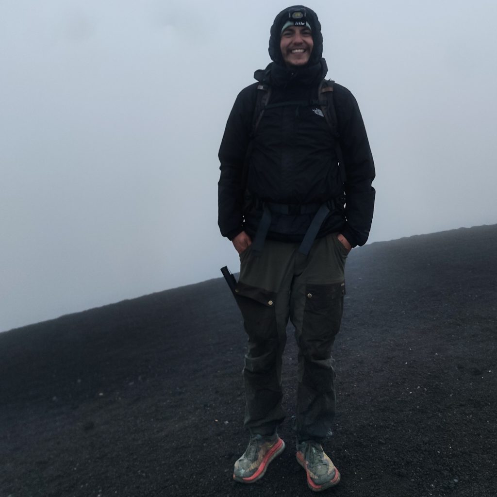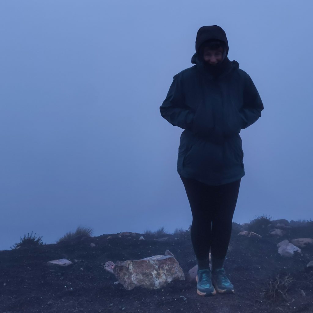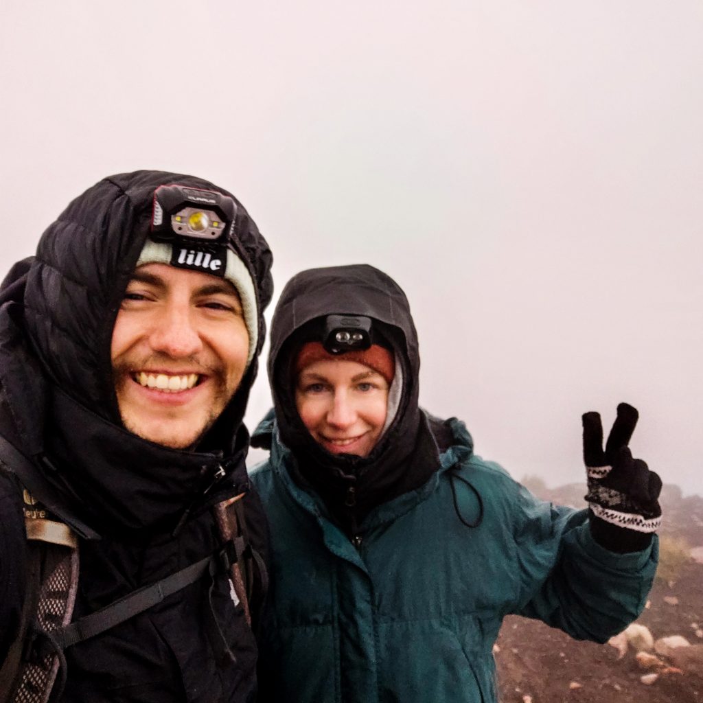 Um 4 Uhr wollen wir zum Gipfel aufbrechen. Um halb vier steht einer der Guides bei uns im Häuschen. Das Wetter sieht sehr schlecht aus. Wir können gerne auf den Berg gehen, aber wahrscheinlich werden wir rein gar nichts sehen. Eine kleine Enttäuschung am „Morgen“. Nachdem es gestern Abend schon komplett zugezogen hat und wir nichts mehr vom Fuego, geschweige denn den Sternen gesehen haben, hatten wir zumindest Hoffnung, dass es heute Morgen besser wird. Alle überlegen hin und her. Konsti ist der erste, der aufspringt und sagt, dass wir auf jeden Fall hochgehen wollen. Immer mehr gesellen sich dazu. Ein paar bleiben liegen. Es ist super kalt, aber mit knapp 15 Leuten machen wir uns auf den Weg. Es geht direkt wieder steil bergauf und trotz der Kälte wird uns schnell warm und wir kommen ins Schwitzen. Kurz vor dem Gipfel sollen wir alles anziehen, was wir haben. Oben wird es ungemütlich. Wie wahr. Oben ist es super windig und komplett neblig. Wir sehen genau GAR NICHTS. An ein paar größeren Steinen suchen wir Schutz und setzen uns hin. Kaum hat Konsti sich hingesetzt, hüpft einer der Hundis, die uns hoch begleitet haben, auf seinen Schoß. Ihm scheint sehr sehr kalt zu sein. Er kuschelt sich ein und lässt sich von Konsti streicheln und zugleich wärmen. Richtig niedlich.