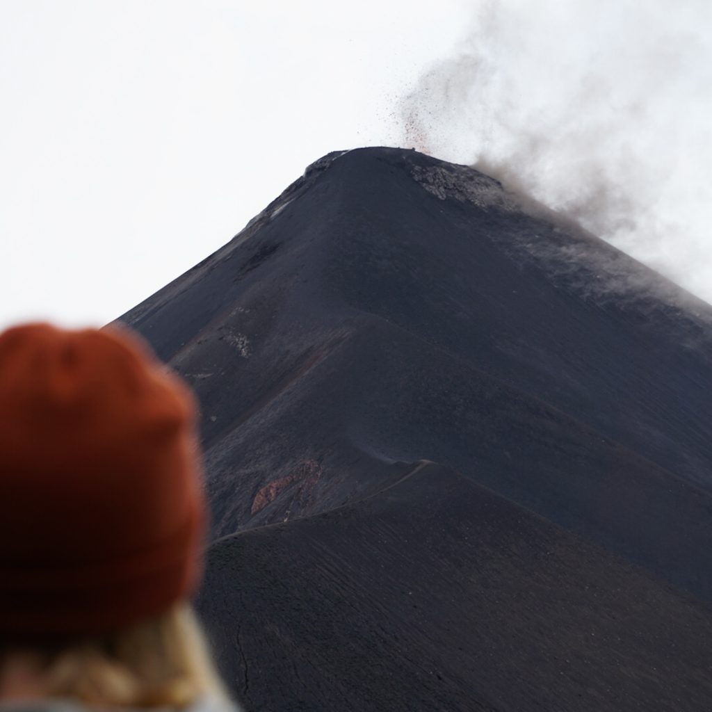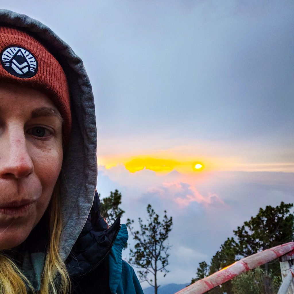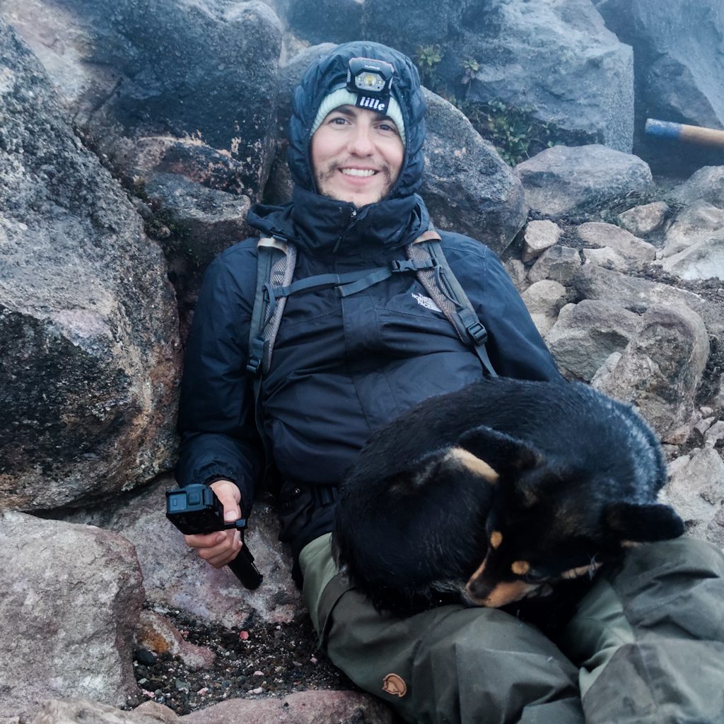 Um 4 Uhr wollen wir zum Gipfel aufbrechen. Um halb vier steht einer der Guides bei uns im Häuschen. Das Wetter sieht sehr schlecht aus. Wir können gerne auf den Berg gehen, aber wahrscheinlich werden wir rein gar nichts sehen. Eine kleine Enttäuschung am „Morgen“. Nachdem es gestern Abend schon komplett zugezogen hat und wir nichts mehr vom Fuego, geschweige denn den Sternen gesehen haben, hatten wir zumindest Hoffnung, dass es heute Morgen besser wird. Alle überlegen hin und her. Konsti ist der erste, der aufspringt und sagt, dass wir auf jeden Fall hochgehen wollen. Immer mehr gesellen sich dazu. Ein paar bleiben liegen. Es ist super kalt, aber mit knapp 15 Leuten machen wir uns auf den Weg. Es geht direkt wieder steil bergauf und trotz der Kälte wird uns schnell warm und wir kommen ins Schwitzen. Kurz vor dem Gipfel sollen wir alles anziehen, was wir haben. Oben wird es ungemütlich. Wie wahr. Oben ist es super windig und komplett neblig. Wir sehen genau GAR NICHTS. An ein paar größeren Steinen suchen wir Schutz und setzen uns hin. Kaum hat Konsti sich hingesetzt, hüpft einer der Hundis, die uns hoch begleitet haben, auf seinen Schoß. Ihm scheint sehr sehr kalt zu sein. Er kuschelt sich ein und lässt sich von Konsti streicheln und zugleich wärmen. Richtig niedlich.