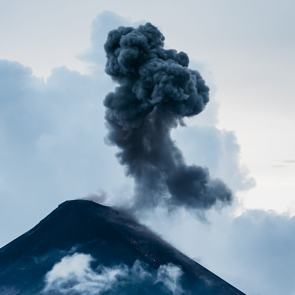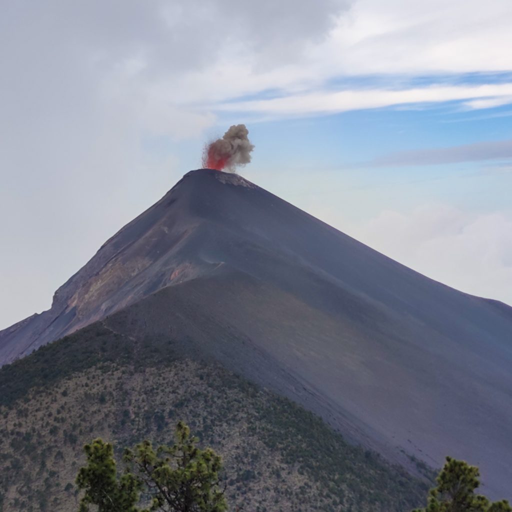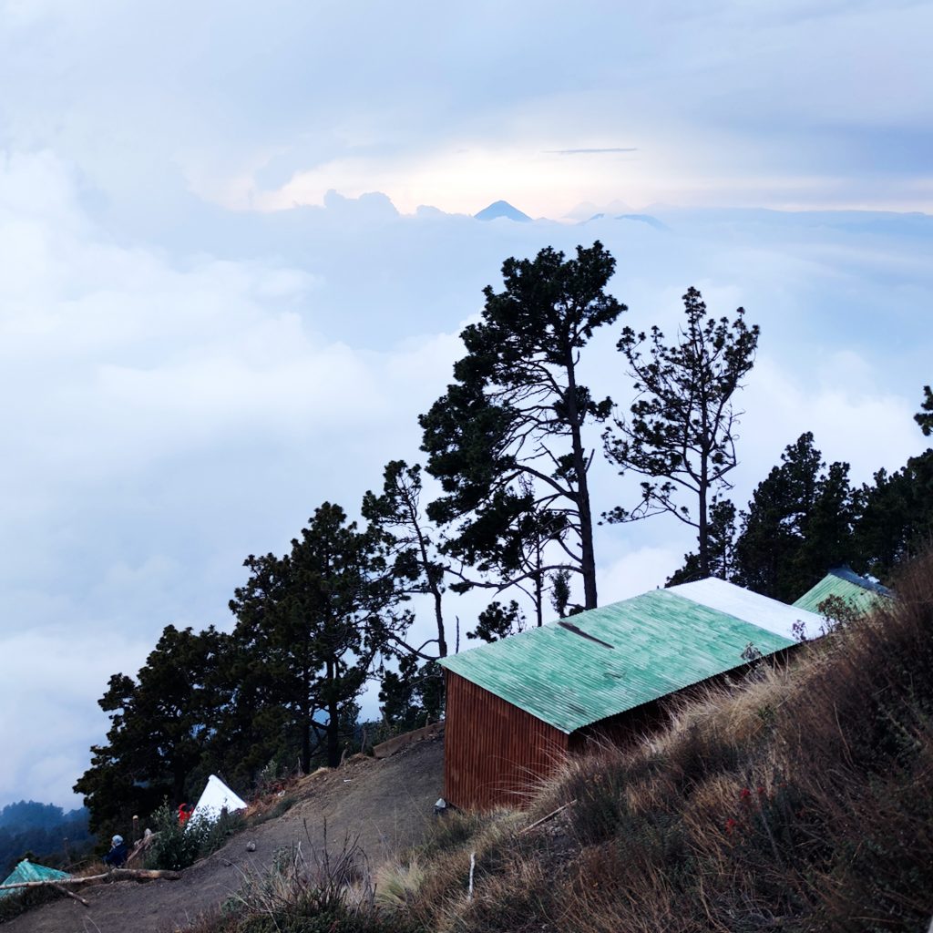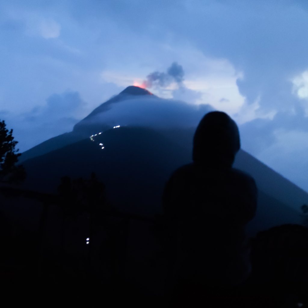 Wir haben es geschafft. Das war ein kleiner Kampf und tatsächlich sehr sehr anstrengend. Aufgrund der Gruppe hat sich eine etwas andere Dynamik ergeben. Wären wir alleine gewandert, wären wir wahrscheinlich deutlich langsamer gelaufen, hätten aber auch weniger Pausen eingelegt. Hauptsache wir sind angekommen. Das Camp besteht aus ein paar Hütten, einem Toilettenhäuschen, einer Lagerfeuerstelle und einem kleinen Häuschen für die Guides. Wir versammeln und erstmal alle um die Feuerstelle. Glück für uns, dass wir nicht die letzten sind, es gibt nämlich nicht genug Sitzplätze. Und diese sind heiß begehrt, die Anstrengung steht einigen ins Gesicht geschrieben. Das Camp liegt (wie viele andere um uns herum auch) am Berg und wir haben einen super Ausblick auf den Fuego. Wir sitzen keine 5 Minuten am Camp, als es eine erste Eruption gibt. Wir hören ein lautes Grummeln, darauf folgt eine große Aschewolke, die in den Himmel gepustet wird. Wow, das ist so cool. Die Begeisterung bei allen ist sehr groß und alle schauen gespannt zum Fuego, natürlich hat so ziemlich jeder sein Handy gezückt. Wer weiß, wie lange die Sicht auf den Fuego noch gegeben ist. Das Wetter ist heute tatsächlich sehr wechselhaft und immer wieder zieht es zu.