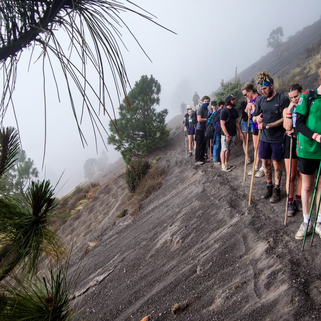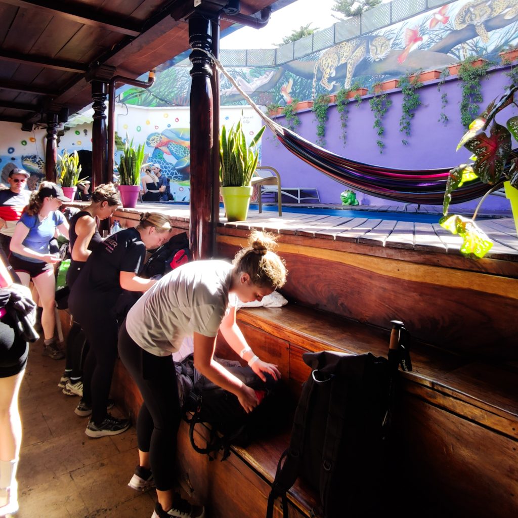Wir werden von unseren Guides begrüßt und bekommen erklärt, wie der heutige Tag verlaufen wird. Wir werden gemeinsam als Gruppe laufen und immer wieder Pausen machen, damit der Rest der Gruppe aufschließen und wir verschnaufen können. Gegen Nachmittag kommen wir dann im Lager an. Dort müssen wir einen Liter Wasser an die Guides abdrücken. Mit diesem werden dann Speisen und weitere Getränke zubereitet. Oben angekommen gibt es dann das Angebot, noch einen „Ausflug“ zum Fuego Vulkan zu machen. Dieser Abstecher, der knapp drei weitere Stunden dauert, ist nicht in der Tour inkludiert und freiwillig. Er kostet extra und man kommt der Lava des Fuego ein ganzes Stück näher. Wir haben bereits davon gehört und auch wenn es sich cool anhört, haben wir schon beschlossen, dass wir den Teil der Tour auslassen. Nach der Einführung kann es losgehen. Wie eine kleine Entenfamilie, ok, sagen wir wie eine sehr große Entenfamilie, stiefeln wir hintereinander aufgereiht los. Ganze 10 Minuten geht es durch einen kleinen Wald und wir halten zum ersten Mal an einer Art Restaurant. Wir schauen uns alle etwas verdutzt an, jetzt schon eine Pause? Man kann Säfte, Frühstück, Kaffee und Snacks kaufen.