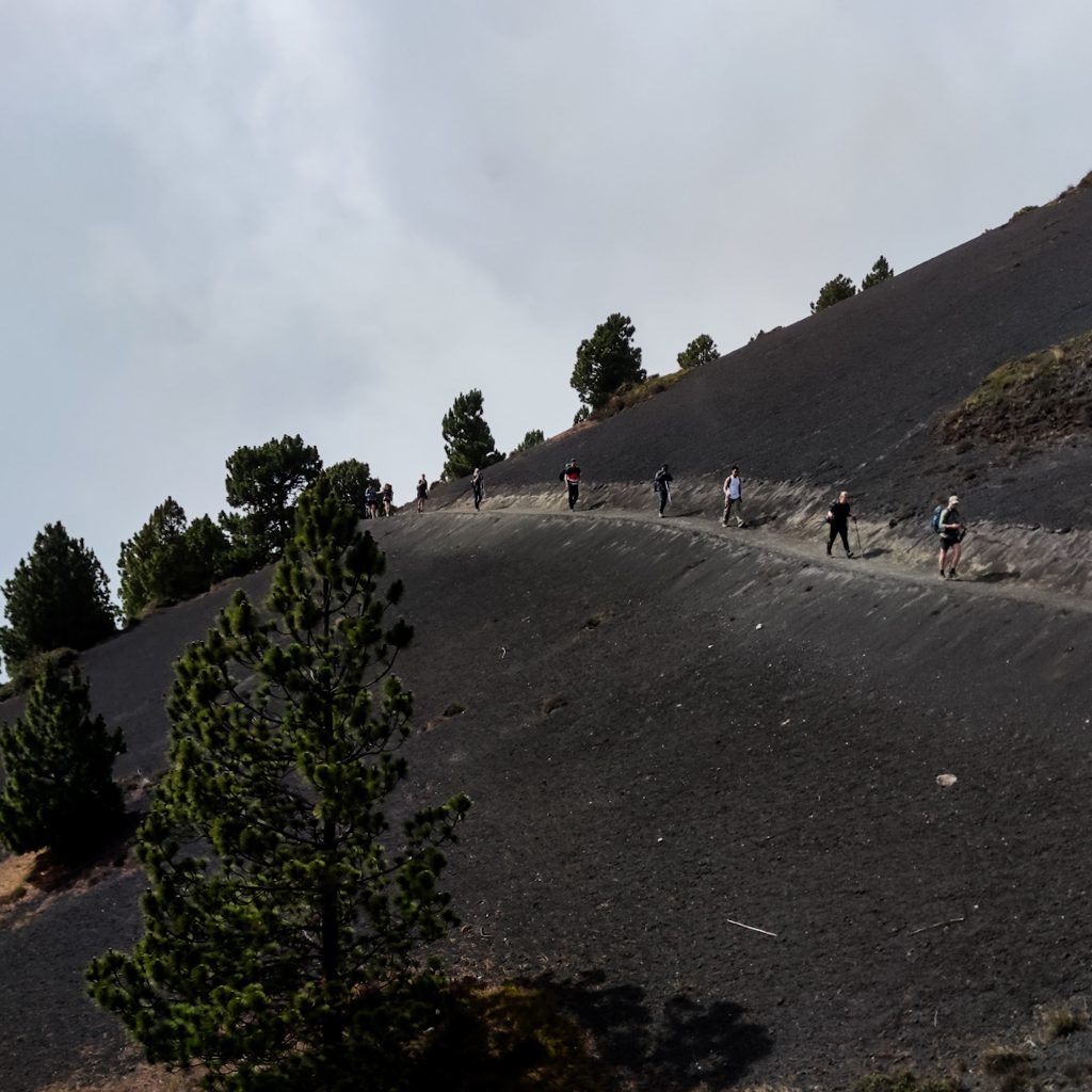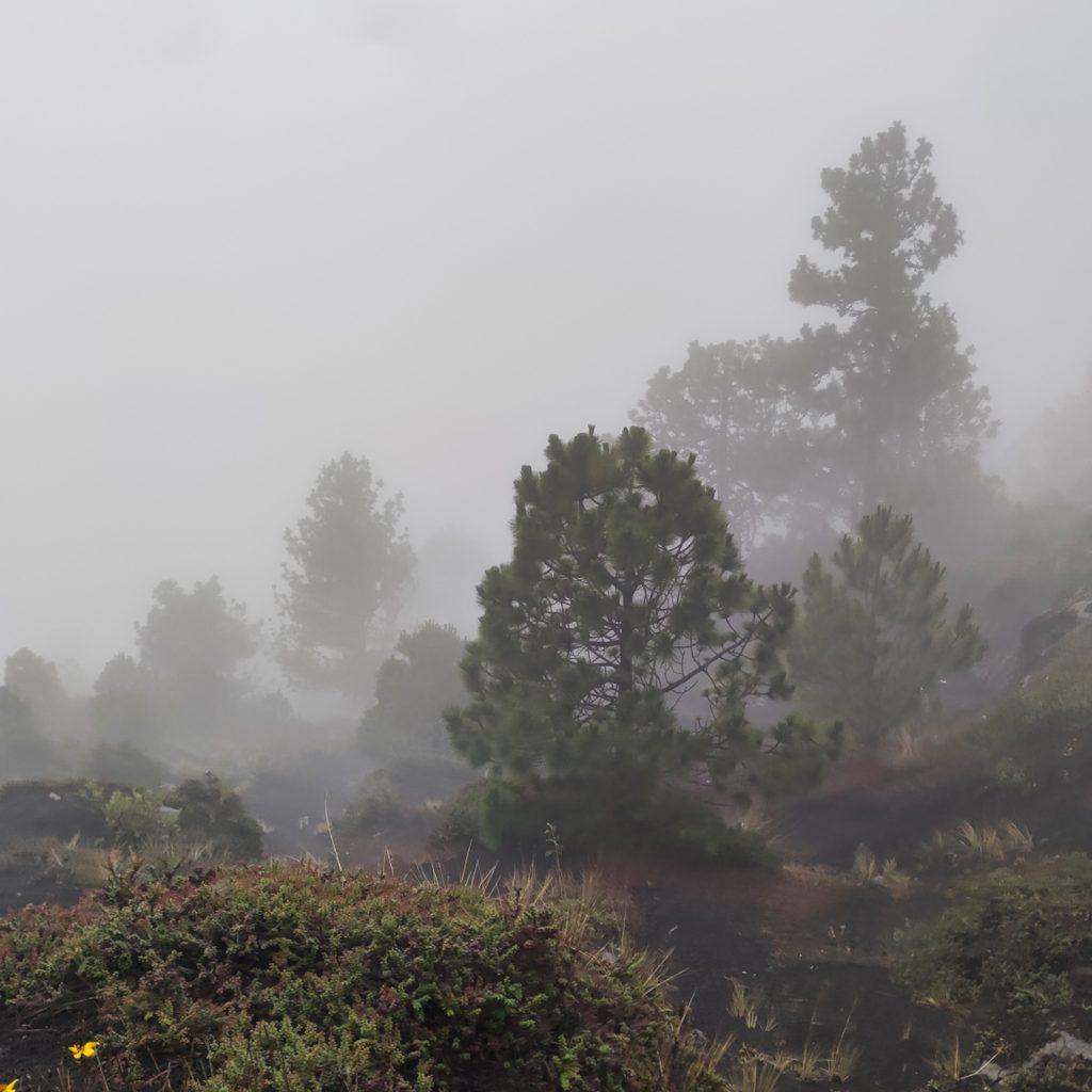 Natürlich bergauf. Die Höhe ist nun wirklich gut zu spüren und wir haben das Gefühl, dass wir langsamer voran kommen. Konsti schaut immer wieder auf den Höhenmesser sowie auf die Route auf seinem Handy. Caro nicht, natürlich nicht, wie auch ohne Handy. Grrr. Sie bemerkt schnell, wie oft sie eigentlich immer ihr Handy zu Hand hat. Zum Fotos machen, um die Uhrzeit zu checken, naja für all das irgendwie. Die Wut und Emotionen können nun gut in die Anstrengung fließen. Irgendwann erreichen wir die Baumgrenze. Von nun an laufen wir eher auf schwarzer Vulkanasche, schön staubig, aber dafür auch nicht mehr ganz so steil. Es folgen noch ein paar kurze Kletterpartien und eine immer schönere Aussicht. Vorausgesetzt man sieht etwas, denn der Nebel zieht immer wieder zu. Wir wollen nicht pessimistisch sein, aber so langsam überlegen wir, was wir überhaupt zu sehen bekommen. Immer wenn es aufklart und die Wolken mit dem starken Wind schwinden, spürt man die Erleichterung in der Gruppe.