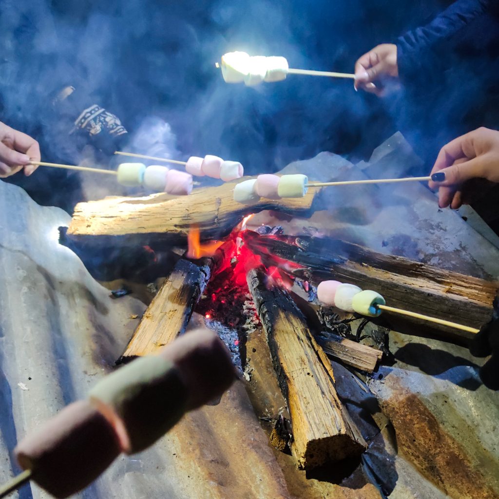 Es ist mittlerweile richtig kalt und wir sind richtig glücklich, als unsere Guides das Lagerfeuer anmachen. Glücklich sind wir auch, dass wir alle einen guten Platz direkt am Lagerfeuer ergattern. Da die anderen noch unterwegs sind, ist für uns noch genug Platz. Das tut gut. Bevor die anderen zurück sind, bekommen wir das Abendessen serviert. Zuvor läuft einer der Guides aber noch mit einem Tablett herum: Rotwein! Na wenn das mal kein Premium-Camping ist. Wir stoßen gemeinsam an. Zum Abendessen bekommen wir gefüllte Zucchini, Kartoffeln und etwas „al dente(s)“ Gemüse. Wir quatschen ein bisschen mit den beiden deutschen Mädels und kommen uns danach nicht mehr nur unfit sondern auch unfassbar alt vor. Die beiden haben gerade Abi gemacht und beschlossen, für ein paar Monate nach dem Abi nach Guatemala zu gehen. Alleine. Kennengelernt haben die beiden sich erst hier. Beide arbeiten in unterschiedlichen Hostels als Volunteer. Parallel bewerben sie sich gerade langsam auf Studienplätze. Krass und ziemlich cool zugleich. Zum Abschluss des schönen Tages rösten wir noch Marshmallows im Lagerfeuern und bekommen eine wärmende heiße Schokolade. Ein Traum.