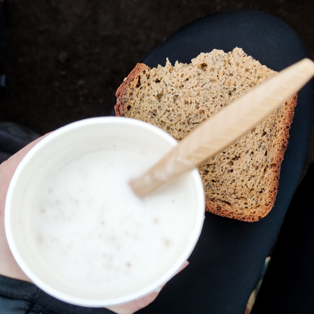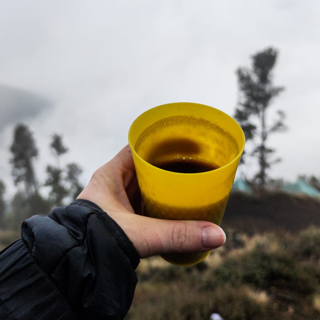 Zurück am Camp gibt es dann auch schon Frühstück: Ein Stück Bananenbrot und ein bisschen warmen Porridge. Vor allem der Kaffee ist Gold wert. Schlechter Kaffee, schlechte Aussicht, aber trotzdem genießen wir noch die letzten Minuten hier oben im Camp.