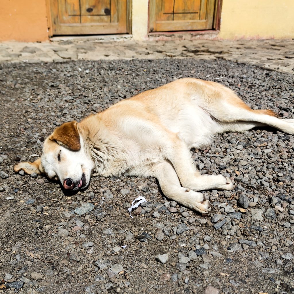 Ihr wisst ja, besonders Caro hatte bereits ein paar unschöne Erfahrungen ab einer gewissen Höhe. Dieses Mal sind wir vorbereitet. Gestern haben wir uns in der Apotheke Tabletten gegen die Höhenkrankheit besorgt. Eine Tablette hat sie bereits gestern Abend genommen, vier weitere sollen über den Tag heute und morgen früh noch eingenommen werden. Wir sind etwas skeptisch, wollen es aber definitiv probieren. Schon eine kleine Verbesserung wäre ja ein Fortschritt. Die Vorfreude auf Kopfschmerzen, Herzrasen, Übelkeit und Durchfall hält sich in Grenzen. Zugebenermaßen hielt sich Caros Begeisterung für diese Tour aufgrund der Übernachtung auf knapp 3.500 Metern generell eher in Grenzen. Aber was tut man nicht alles für ein Naturspektakel und einen Freund, der Feuer und Flamme dafür ist, auf einen aktiven Vulkan zu stolpern. In der Basis angekommen, wird noch ein letztes Mal eine schöne Toilette aufgesucht und der unfassbar kuschlige Riesenhund, der sich dort herumtreibt, gestreichelt.