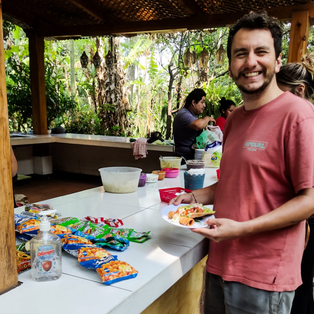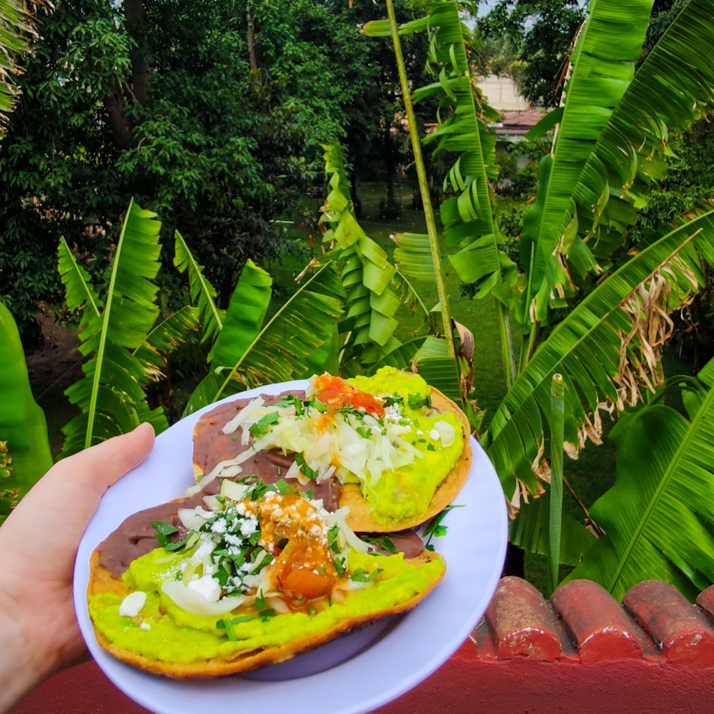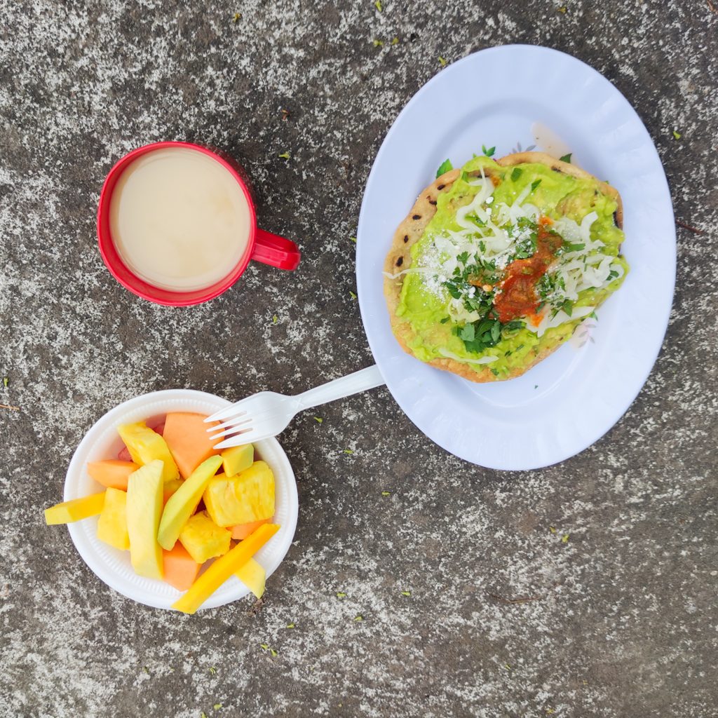 Es gibt einen überdachten Bereich, viele kleine Wege, eine große Wiese, sogar eine Dachterrasse. Es gibt gratis Kaffee und Wasser, selbstverständlich auch eine Toilette. Der Unterricht beginnt jeden Morgen um 8 Uhr, um 10 Uhr findet eine 30 minütige Pause statt und je nachdem, wie viel Stunden man bucht, endet der Unterricht um 12 oder um 13 Uhr. Wir haben täglich vier Stunden Unterricht, was für uns alleine konzentrationstechnisch eine kleine Herausforderung darstellt. In der Pause gibt es ein kleines Häuschen, von dem aus eine Familie kleine Snacks und Getränke verkauft. Besser als jede Schul-Cafeteria! Es gibt immer etwas anderes. Frisch belegte Tostadas, Nachos mit Guacamole und weiteren Toppings. Belegte Brote, mal frittierte Banane und mal Mole. Ab und zu gibt es auch Schalen mit frischem und geschnittenem Obst. Es ist wirklich alles köstlich, tatsächlich sehr günstig und eine gute Gelegenheit, um ein paar lokale Snacks zu testen.