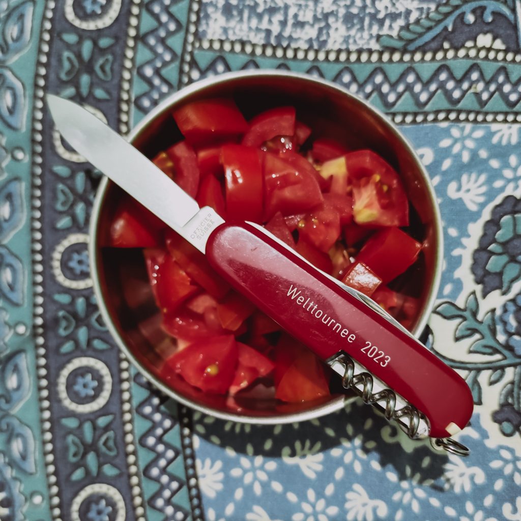 Zuhause angekommen, machen wir es uns auf dem Bett gemütlich und schnibbeln unsere Einkäufe. An dieser Stelle ein großer Dank an Tine und Peter für das „Sackmesser“ (so sagt man wohl in der Schweiz zu einem Schweizer Taschenmesser 🤷🏼‍♀️🤷🏻‍♂️) und an Matthias für das Gewürzkarussel. Wir freuen uns, dass wir unser Equipment fachgerecht einsetzen können. Nach einiger Zeit haben wir es dann endlich geschafft und genießen mehr als zufrieden unser Dinner bei Handy-Kerzenschein und passender Musik auf der Terrasse. Selbstgekocht schmeckt doch immer noch am besten, oder? Zugegebenermaßen ist das selbst kochen nicht unbedingt die günstigere Alternative und spülen müssen wir ja auch noch selbst.