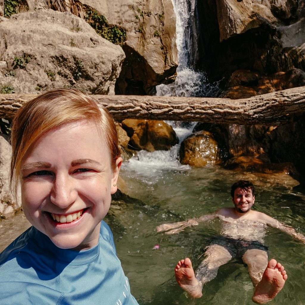 Es sieht wirklich schön aus. Hier sind nur leider auch die meisten Besucher:innen. Deshalb wollen wir es weiter unten versuchen. Wir finden tatsächlich einen „freien“ Spot, schmeißen uns schnell in die Badeklamotten und nutzen unsere Chance. Um nicht noch mehr Aufmerksamkeit zu erregen zieht Caro über den Bikini eine von Konstis Badehosen und ihr Wetshirt an. Weiter oben haben wir ein paar komplett angezogen Frauen baden sehen. Hauptsächlich nutzen aber indische Männer die erfrischende Abkühlung. Es tut so gut, sich bei den heißen Temperaturen zum ersten Mal abkühlen zu können. Wir genießen den Moment und planschen ein bisschen im kühlen Nass, bevor wir uns im Anschluss einen Chai genehmigen.