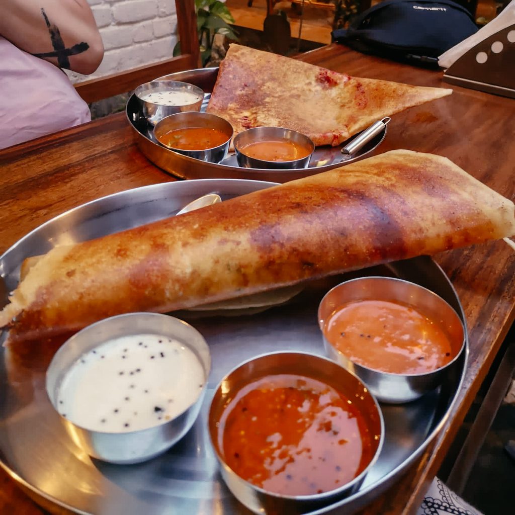 Unseren letzten Abend lassen wir in einem Restaurant mit südindischen Speisen ausklingen. Wir genießen zwei unterschiedliche Dosas mit verschiedenen Chutneys. Unser Kellner erklärt uns, was wir genau vor uns haben und (wahrscheinlich beim Blick in unsere Gesichter) wie wir die Dosas am besten mit unseren Finger essen. Eine richtige Sauerei, die dünnen aber knusprigen Pfannkuchen, die aus fermentiertem Hülsenfrüchten- und Reismehl hergestellt werden, in Stücke zu reißen und in die Chutneys zu tunken. Es gibt ein Tomatenchutney (leicht scharf), das typische Kokos-Chutney mit Kokosraspeln und eine würzige Linsen-Gemüse-Soße. Es schmeckt ganz hervorragend und wir genießen die Atmosphäre, im Innenhof an der frischen, leicht abkühlenden Luft zu sitzen. Als die Mückenschwärme allerdings zu wild werden, machen wir uns auf den Heimweg.