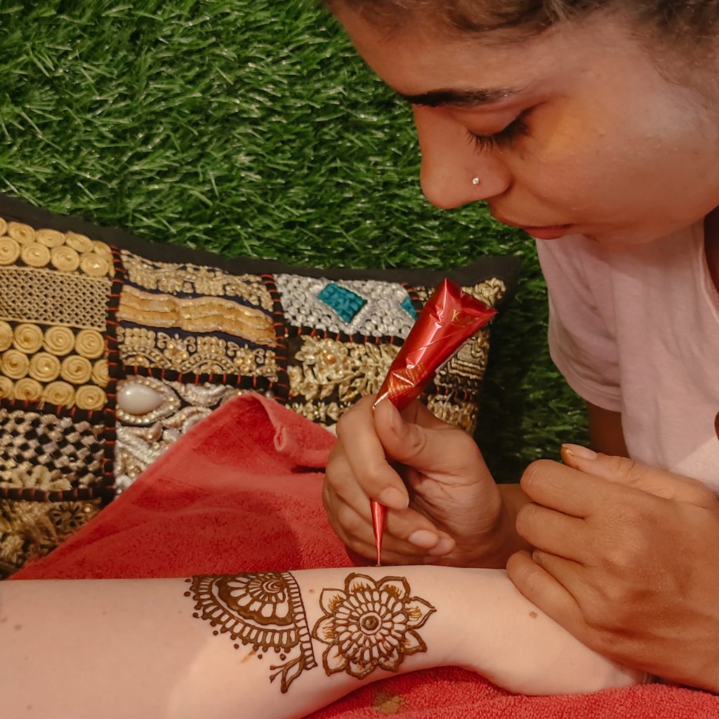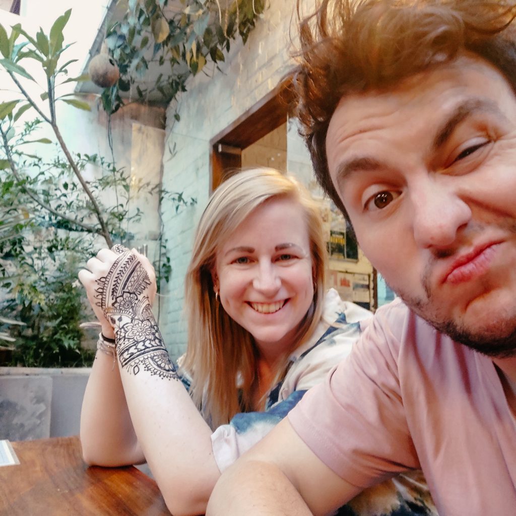 Am Nachmittag haben wir einen Termin. Caro lässt sich ein Henna-Tattoo von Isha malen. In der Ecke eines kleinen Ladens (eine Mischung aus Drogerie und Apotheke) hat sie sich ihr leuchtendes Logo an einer grünen Kunstwiesenwand anbringen lassen. Erstmal stellt sie sicher, dass wir ihr auch ja auf Instagram folgen. Konsti bekommt die Aufgabe zu Filmen und Fotos zu machen. Zu ihrer Enttäuschung hat er leider kein iPhone. Dann beginnt sie ihr kleines Kunstwerk. Nach einer Fotovorlage malt sie kleine Ornamente und Blumen. Das Endergebnis ist super und Caro freut sich sehr.