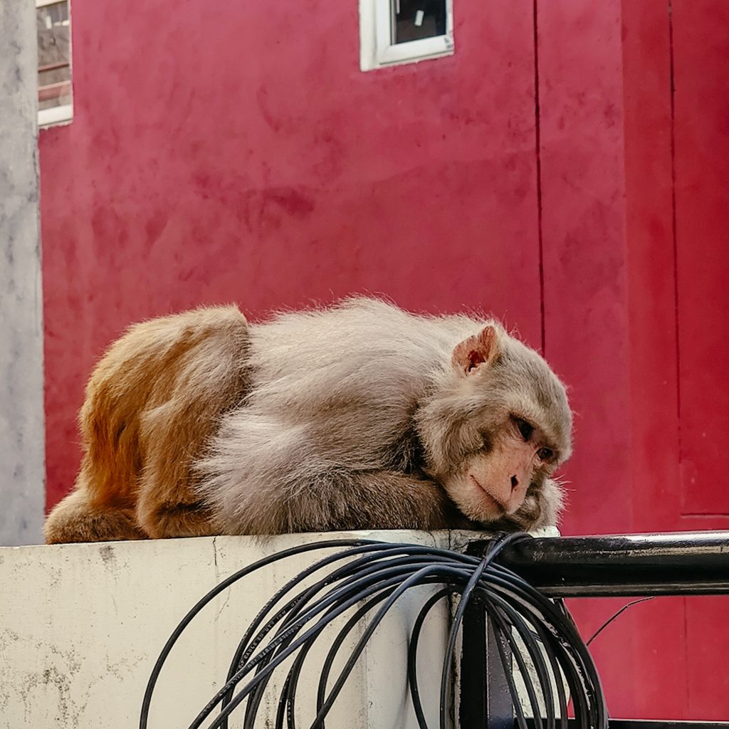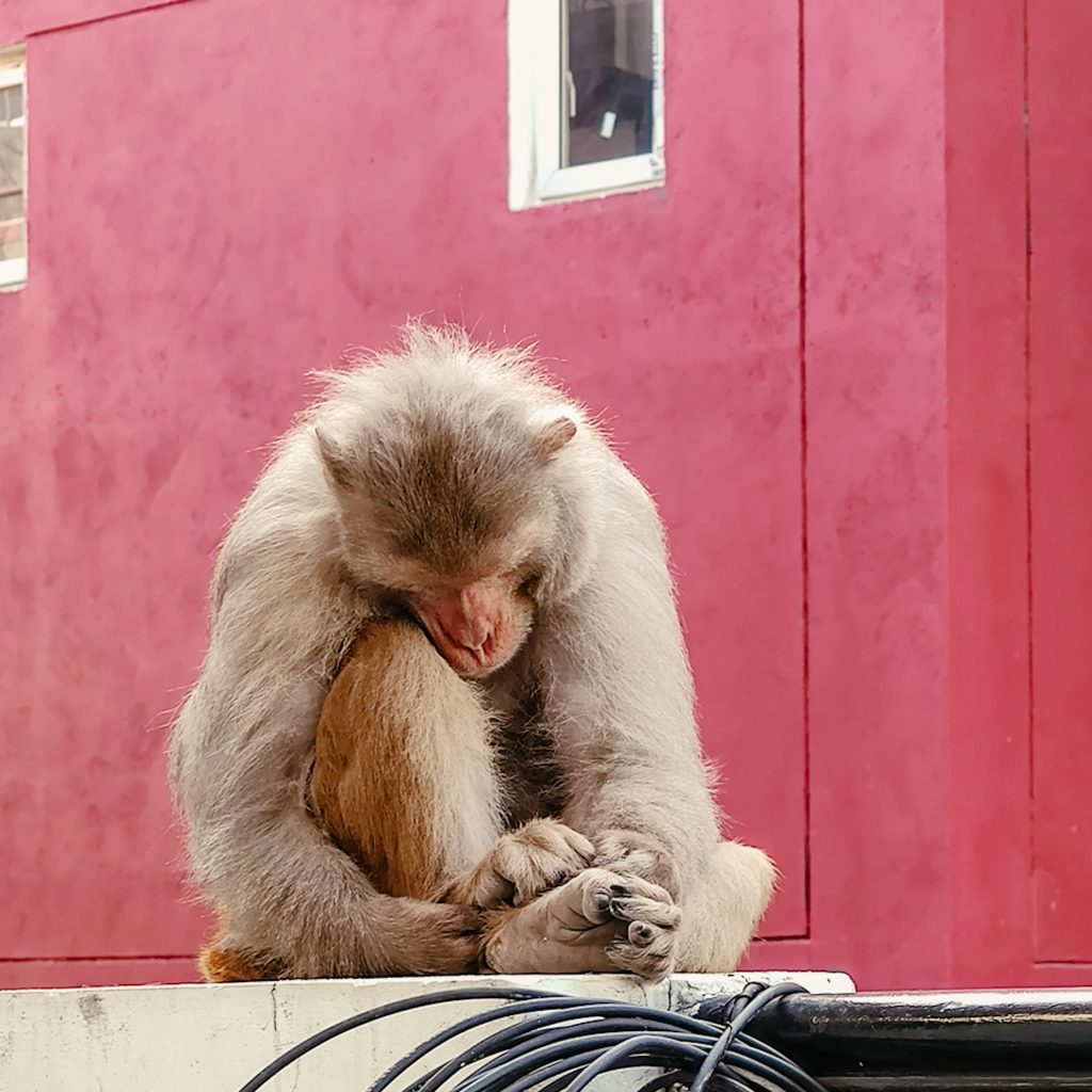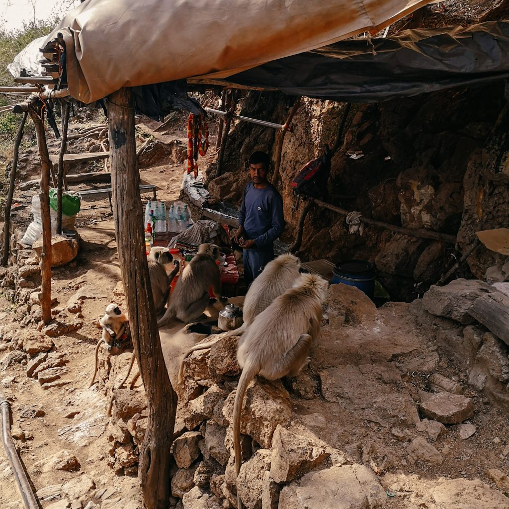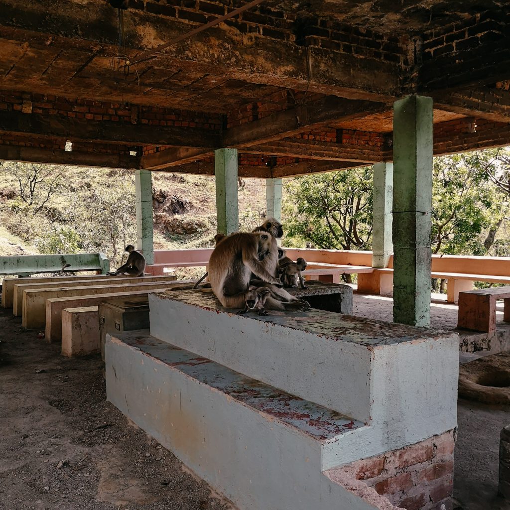 Während wir Pause machen, kommen aus der Gegenrichtung ab und zu indische Tourist:innen, die sich nicht scheuen uns nach Fotos zu fragen und uns dabei ihre Kinder in die Hand zu drücken. Davon sind die Kinder wiederum nicht immer so begeistert, wie die Eltern – wir können es nachvollziehen. Wer möchte schon ein Foto mit zwei Fremden, die mit hochrotem Kopf und kltischnassgeschwitzten Klamotten schnaufend am Wegrand sitzen? Aber wenn Mama und Papa das möchten, müssen die Kinder und auch wir wohl da durch. Zwischendurch kommen wir an nahezu verlassenen Rastplätzen vorbei, die zum Teil von Affen eingenommen wurden (Wo ist eigentlich King Louie?).
