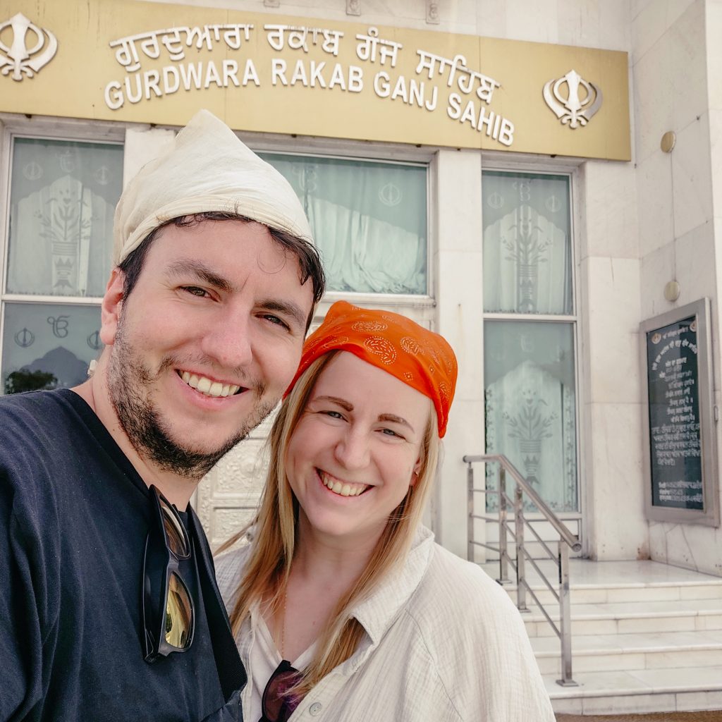 Die Antibiotika scheinen zu wirken und so geht es Konsti am kommenden Tag schon wieder deutlich besser. Auch hier wollen wir nicht zu sehr ins Detail gehen, aber so viel: So langsam kommt er der zweiten Zeile aus „3-Tage-Bart“ von den Ärzten wieder näher. Mit der frischen Energie beschließen wir, den Tag in Delhi etwas zu nutzen. Da wir nach unserem Aufenthalt in Rishikesh noch einmal ein paar Tage in Delhi sein werden, haben wir keinen Druck, alles sehen zu müssen und laufen etwas durch das Regierungsviertel, in dem es jedoch gerade von Polizei nur so wimmelt, da anscheinend irgendein Event im Parlament stattfindet. Überraschend höflich und freundlich werden wir daher von den vielen Männern mit Maschinengewehren gebeten, einen anderen Weg zu nehmen. Mehr zufällig laufen wir daher am „Gurudwara Shri Rakab Ganj Sahib“, einem Tempel der Sikh vorbei. Mehr zu dieser überaus spannenden Religion beschreiben wir, wenn wir nach Amritsar kommen, die eine der wichtigsten Städte im Sikkhismus ist. Sehr freundlich werden wir am Tempel begrüßt und angewiesen, unsere Haare mit einem der zur Verfügung gestellten Tücher zu bedecken. Während die Sikh-Männer mit ihren kunstvoll gebundenen Turbanen (Turbans, Turbo, Turbinen, … Was zum Teufel ist der Plural von Turban??) sehr erhaben wirken, sehen wir eher aus wie eine Piratin und ein Schlumpf.