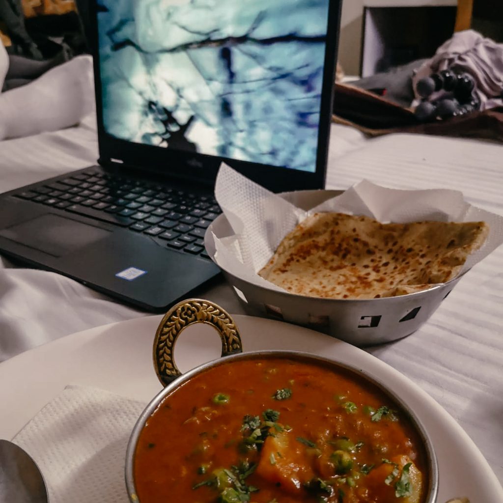 Auch wenn Rishikesh vor Varanasi liegt und der Ganges hier vergleichsweise frisch aus dem Himalaya fließt und daher minimal weniger verseucht ist, finden auch hier Leichenverbrennungen. Trotz der warmen Temperaturen, verfolgen wir das spirituelle Schauspiel aus sicherer Distanz und lehnen diese Art der Abkühlung dankend ab. Neben der Spiritualität scheint aber auch der Erlebnistourismus bei den Inder:innen hoch im Kurs zu sein. Das Angebot für Rafting-Ausflüge im Ganges ist riesig. Entgegen Caros Aussage: „Das wird doch kein/e Tourist:in freiwillig machen.“ (mit entsetztem Gesichtsausdruck), sehen wir unten am Fluss ein Boot nach dem nächsten vorbeifahren. Es wird in Alltagskleidung froh und munter im Ganges geplanscht. Im Nachhinein betrachtet macht das ja sogar Sinn. Man kann direkt zwei Fliegen mit einer Klappe schlagen: Freizeitspaß mit einem „spirituell reinigendem Bad“. Ein sehr gutes Geschäftsmodell, zumindest für die inländischen Tourist:innen. Wir streicheln noch ein paar Kühe und machen uns gegen Abend auf dem Weg zum Italiener. Die Google Bewertungen halten was sie versprechen und wir sind im siebten Himmel. Unter Umständen wird das nicht unser letzter Besuch hier sein.