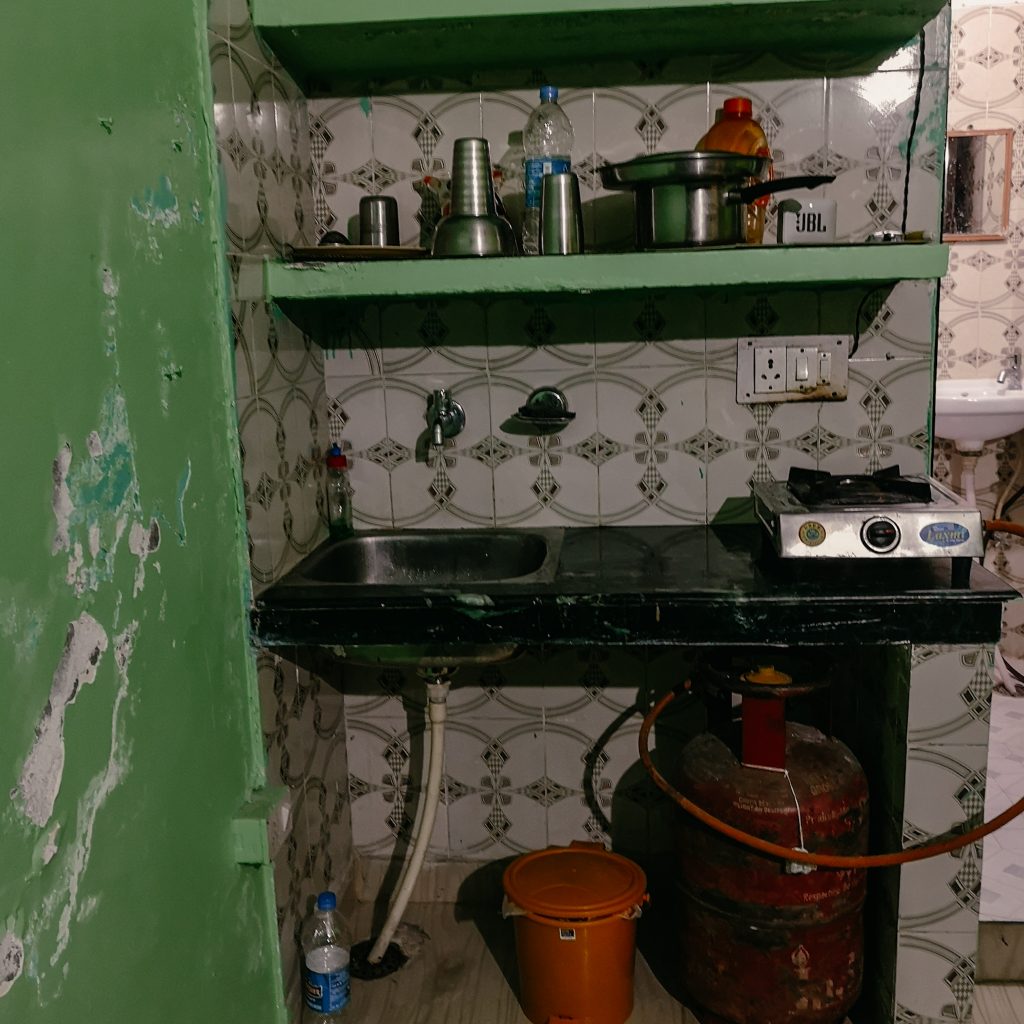 Zugegebenermaßen sieht diese Kochnische etwas heruntergekommen aus, aber wir freuen uns trotzdem wie kleine Kinder am Geburtstag. Vor dem Zimmer steht ein Kühlschrank und es gibt eine kleine überdachte Terrasse.