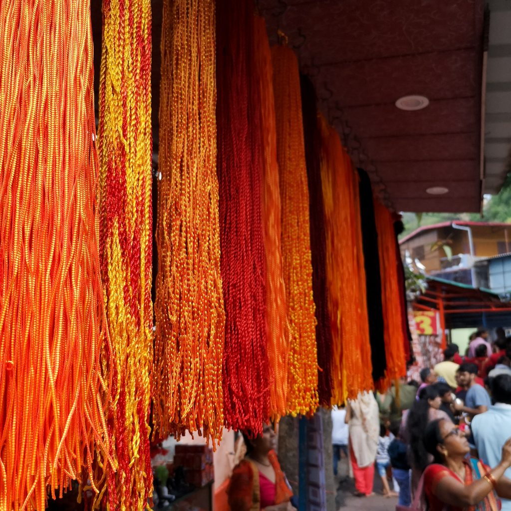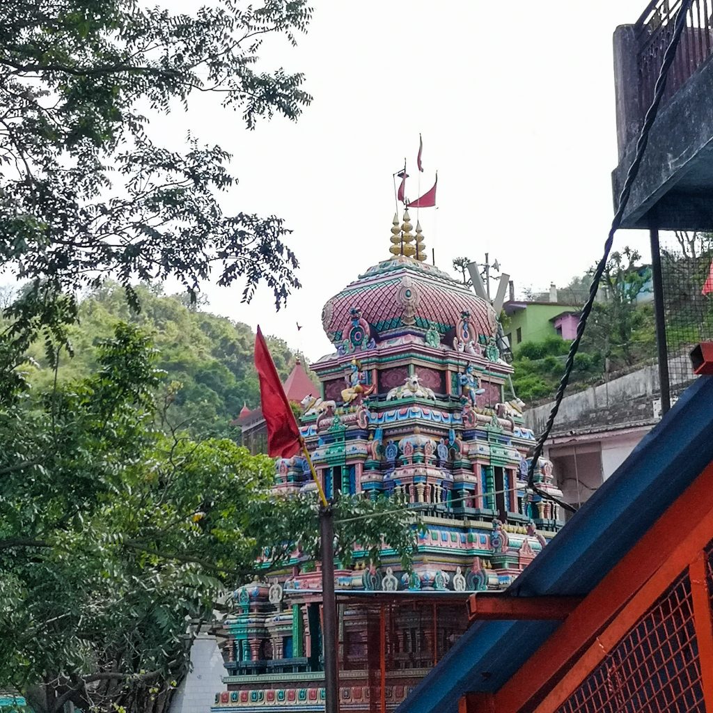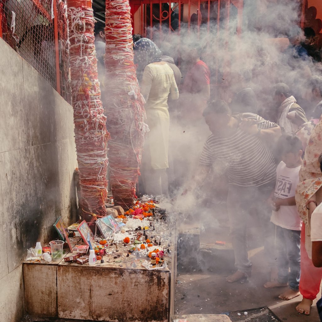 Die Aussicht wird immer besser und wir haben einen tollen Ausblick auf das Ganges-Tal und auf Rishikesh. Zu irgendetwas muss der Aufstieg ja gut sein. Bei unseren Pausen genießen wir die Stille, das Gezwitscher der Vögel und sehen auch noch ein paar Pfauen. Nach fast vier Stunden nähern wir uns dem Ziel, einem bekannten Tempel. Das letzte Stück des Weges ist sogar mit einem Zaun geteilt, die eine Seite für den Hin- und die andere für den Rückweg. Das lässt uns erahnen, dass hier zu anderen Zeiten wesentlich mehr los sein muss. Die Fülle an Geschäften nimmt zu und damit auch das Angebot an „Opfergaben-Tellern“. Kurz vor dem Tempel holt uns eine Gruppe von jungen Männern ein, die wir zuvor bereits überholt hatten. Überrascht davon, wie schnell wir gehen können und dass wir dieses wahnwitzige Tempo ausschließlich mit Wandern als Training erreichen konnten, muss natürlich unbedingt „ein“ Selfie gemacht werden. Am Tempel ziehen wir uns die Schuhe aus und laufen direkt in eine Masse von Gläubigen. Sie stehen für den Tempel an und wir mischen uns dazu, aus der Schlange führt kein Weg zurück. Wir sehen weit und breit keine anderen Tourist:innen, der Gang ist vergittert und wir sind zwischen vielen Menschen. Wir laufen einfach mit und schauen, was alle anderen so machen. Unter anderem nehmen sie das Wasser aus einem kleinen Plastikbecher vom erstandenen Opfergabenteller und übergießen eine Figur damit, Blüten werden verstreut und viele Gegenstände des Tempels werden während des Betens berührt. Es sind viele indische Tourist:innen, für die dieser Ort besonders ist und wofür sie extra hierher gekommen sind.