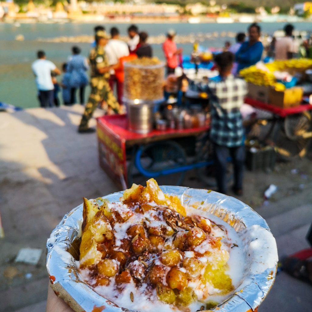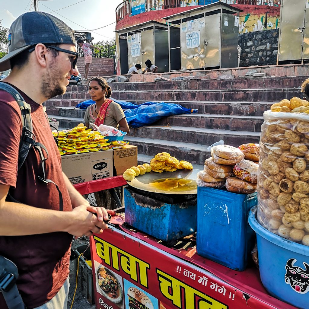Vor allem Caro hat ordentlich Kohldampf und auf der anderen Seite vom Fluss angekommen, gönnen wir uns eine weitere Pause mit einem Snack von einem Straßenstand direkt am Ganges. Aloo und Tikki Chat – köstlich! Der Snack hat sich bei uns auf Platz 1 abgesetzt.
