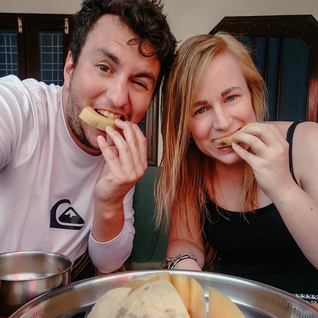 Beweisfotos davon gibt es leider keine, ihr dürft aber eurer Fantasie freien Lauf lassen. Wir genießen die Abschlussmeditation und gehen gut gelaunt und zufrieden aus unserer ersten Yogastunde in Indien. Während unserer Tage in Rishikesh gehen wir noch zwei weitere Male zum Yoga. Das ändert zwar nichts an unserer Gelenkigkeit, aber es macht uns wirklich Spaß.