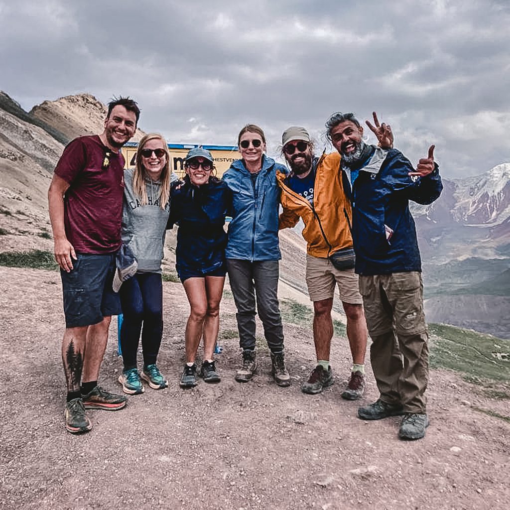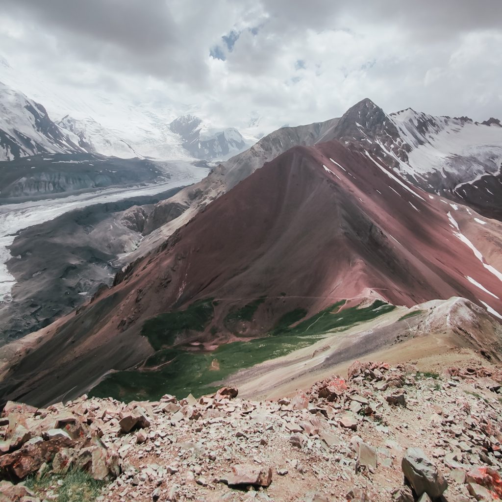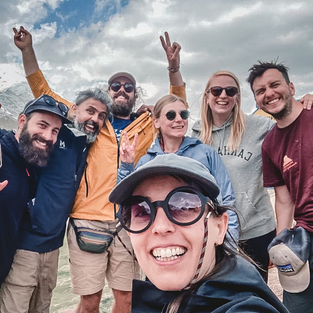 Und wer taucht dann plötzlich aus? Vic, der Inder, kommt nach uns an. Er erzählt uns, dass er Guide ist und aktuell die zukünftige Route checkt, die er kommendes Jahr mit einer Gruppe wandern möchte. Daher war sein Zwischenstopp im Basecamp etwas länger. Gemeinsam gehen wir noch ein Stückchen weiter Richtung Gipfel des kleinen Hügels neben dem Traveller’s Pass. Die Aussicht wird immer besser, aber es wird auch steiler. Marta und Caro beschließen hier zu bleiben und auf die Jungs zu warten, die weiter hoch gehen. Von oben ist die Aussicht nochmal spektakulärer und man sieht den gesamten Gletscher.