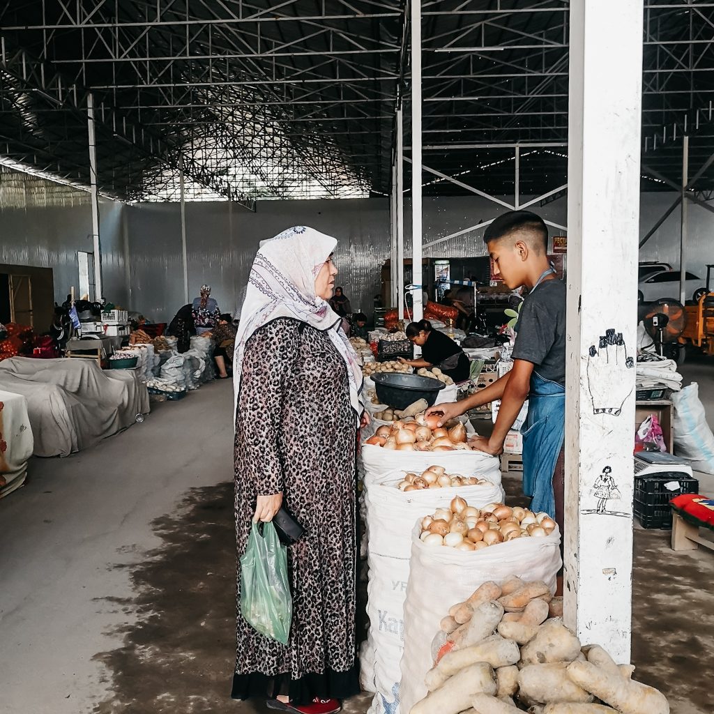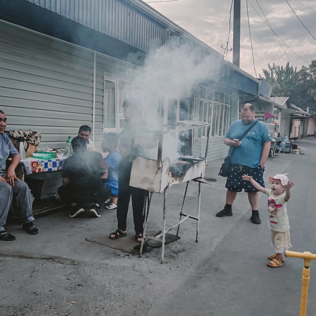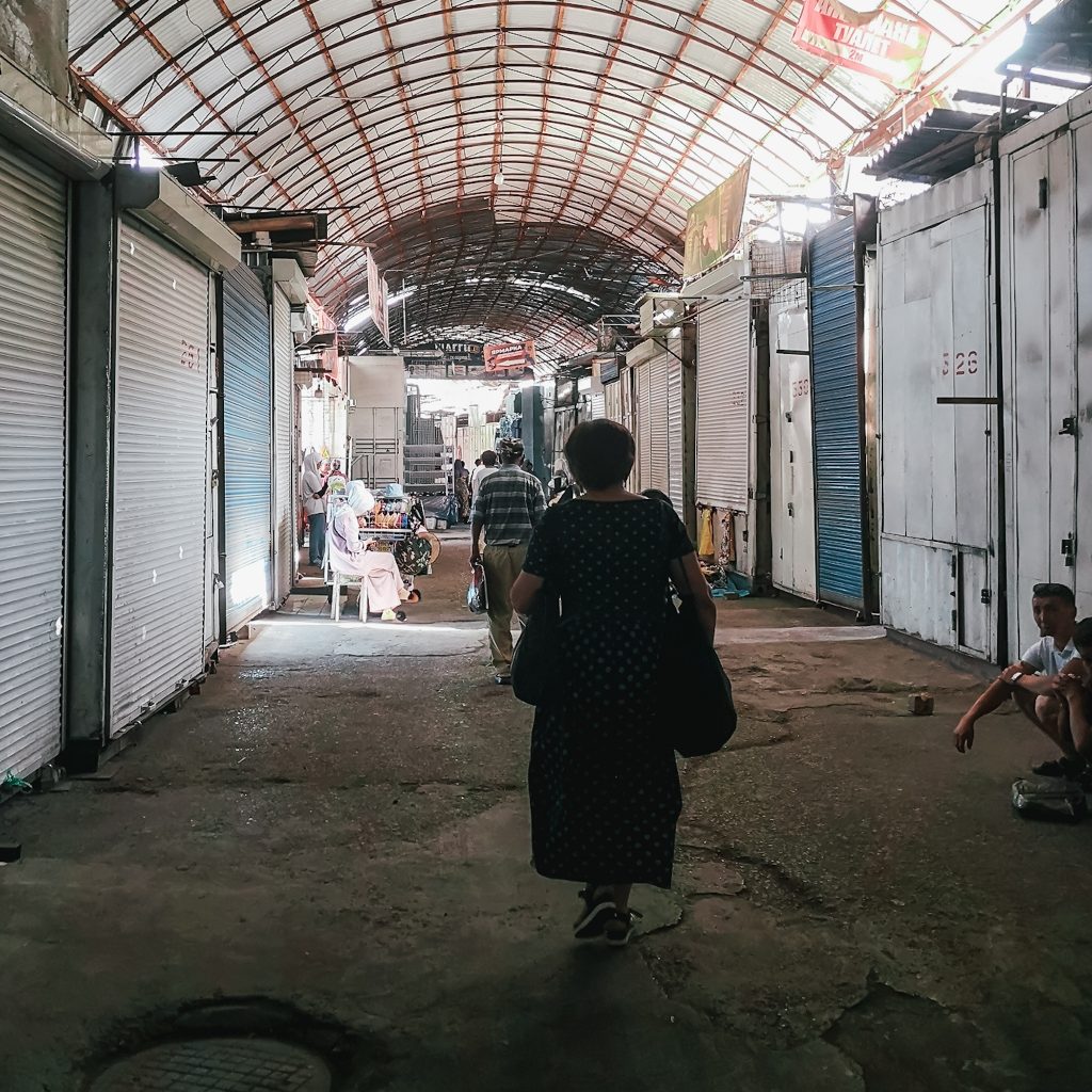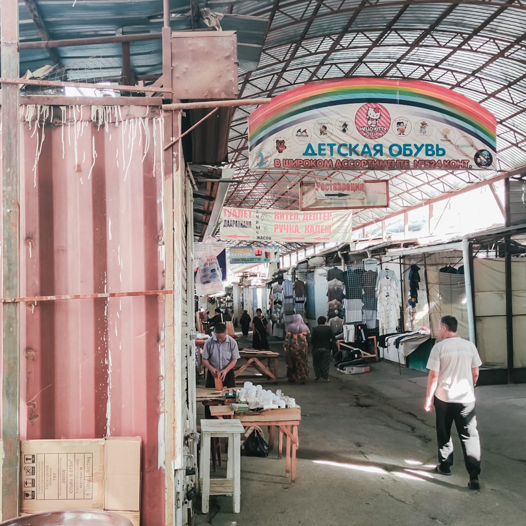 Nachdem wir noch bis 1 Uhr an unseren Blog geschrieben haben, fällt uns das Aufstehen heute schwerer. Wir wollen aber zum Osch Bazar und der soll besonders am Sonntagmorgen interessant sein. Wir machen uns also vor dem Frühstück auf den Weg dorthin. Heute lassen es die Verkäufer:innen wohl auch etwas langsamer angehen. Viele Container (die meisten Bazare und auch viele Gebäude bestehen in Kirgisistan aus alten Schiffscontainern) sind noch zu oder es wird gerade aufgebaut. Hauptsächlich ist ramschige Kleidung zu finden, aber auch allerlei anderer Kram: Töpfe mit Erdbeeren (wie im unserem Hostel), Pflanzen, Trockenfrüchte und auch frisches Obst und Gemüse.