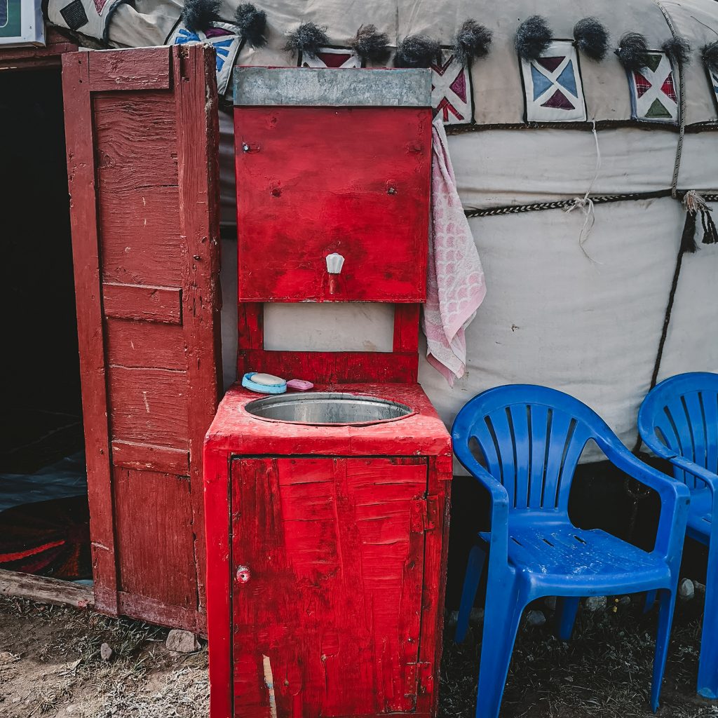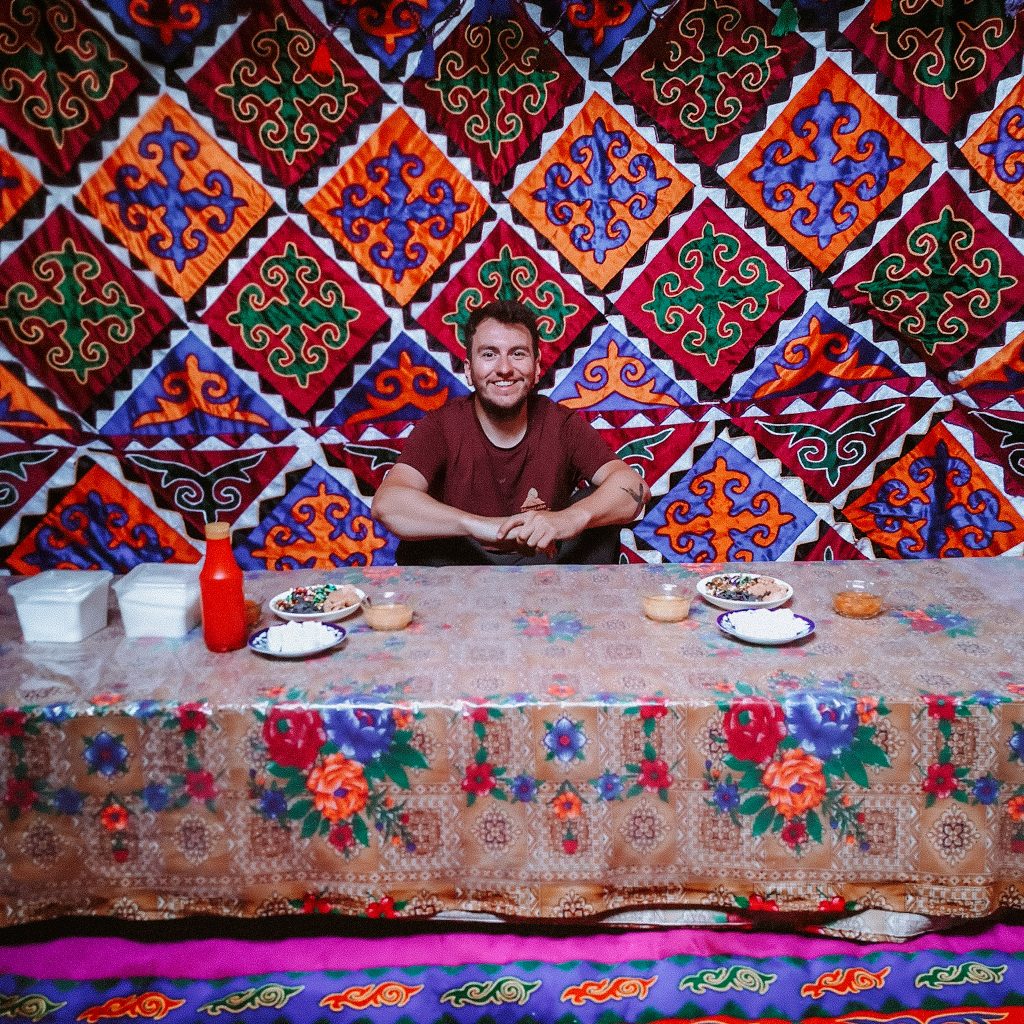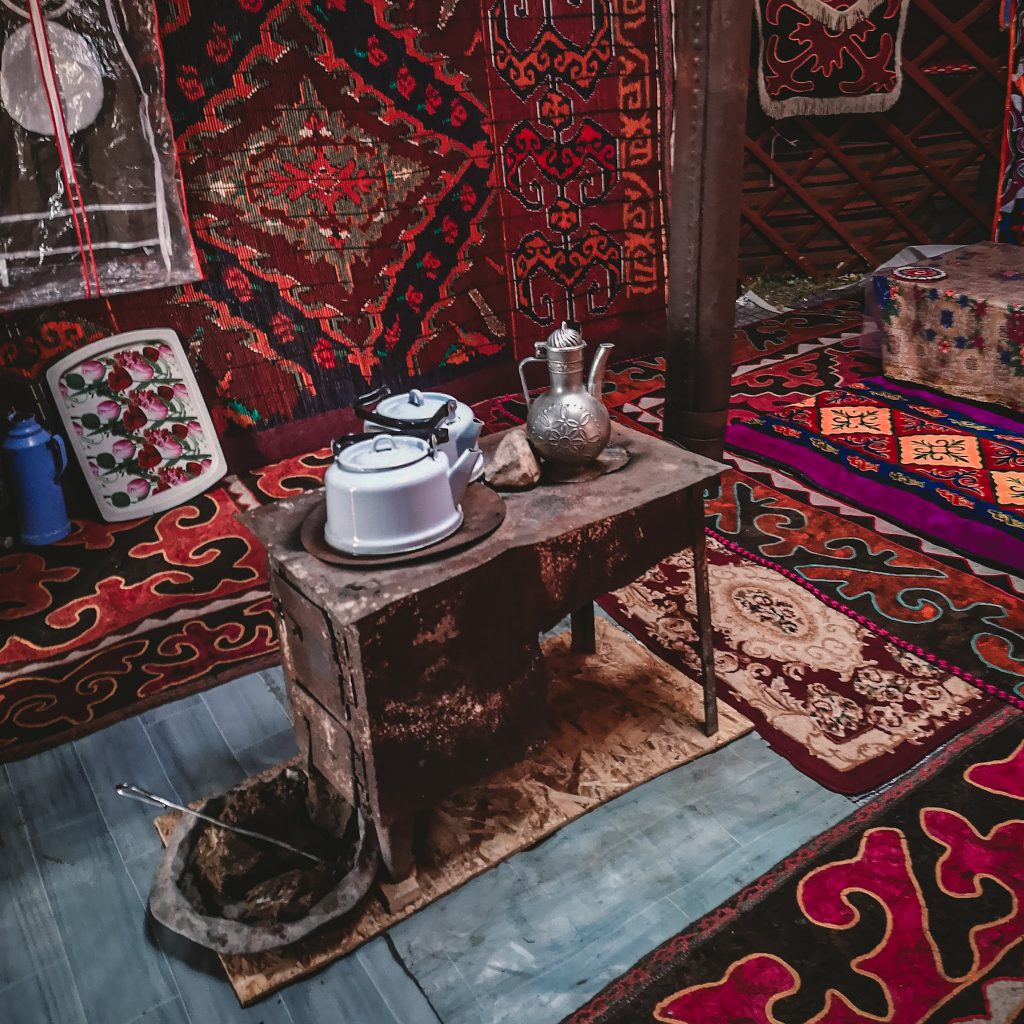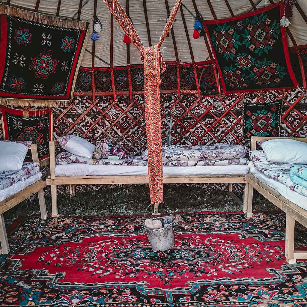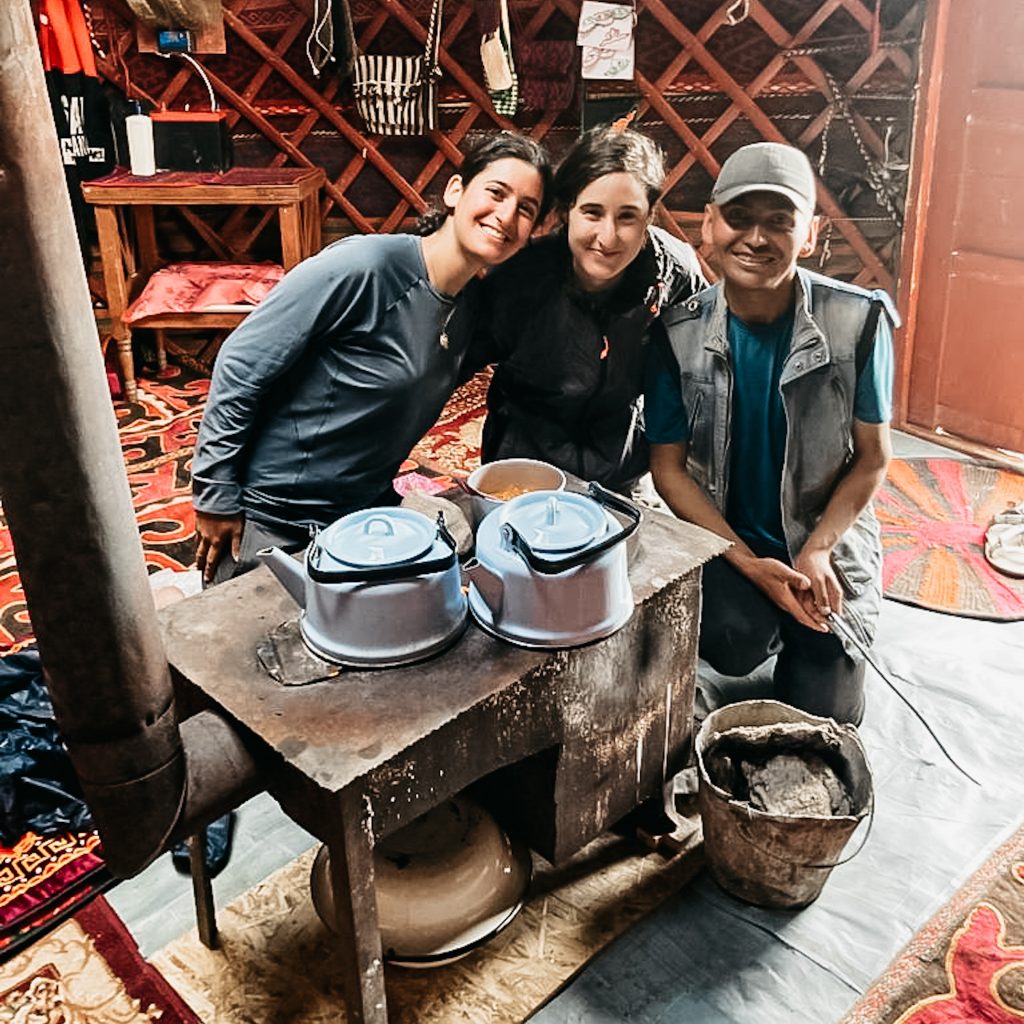 Nach einer kurzen Siesta gehen wir in die Gemeinschaftsjurte. Auch hier wird uns nochmal deutlich, dass das Camp sehr neu ist. Alles ist in einem sehr guten Zustand und die Jurte wirkt fast etwas geschmückt. In der Mitte ist wieder ein Ofen, am Rand nehmen wir am niedrigen Tisch auf dem Teppich Platz. Es gibt schonmal Tee, Marta und Victor sind schon da und auch Lisa kommt kurze Zeit später hinzu. Die beiden Mädels aus Israel haben für das Zelten eine defekte Gasflasche gekauft, es ist aber kein Problem, dass die beiden auf dem Ofen kochen. So sitzen wir alle wieder zusammen und quatschen ausgiebig. Wir lachen viel und der Abend ist richtig nett.