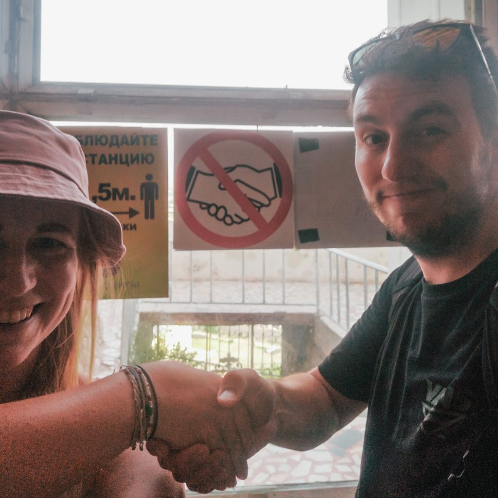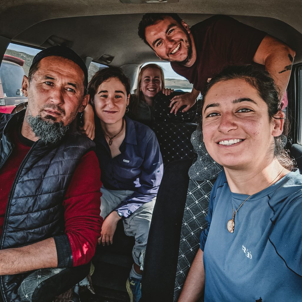 Der Ausflug ins Pamir Gebirge wird das letzte Mal Wandern in Kirgistan sein. Um 14 Uhr soll die Marschrutka von Osch nach Sary Mogul fahren. Wir sind früh dran und das ist dieses Mal seeeehr gut. Als wir ankommen, ergattern wir zwei Plätze vorne, kurz nach uns kommen noch weitere Tourist:innen. Eigentlich scheint der Kleinbus schon voll, aber der Fahrer hat noch etwas in petto. Und zwar vier kleine Mini-Klapp-Hocker, die einfach im Gang aufgestellt werden. Okay, so kommen alle mit, Anschnaller gibt’s hier ja sowieso nicht und nach Sicherheit fragt auch keiner. Man sollte vielleicht noch dazu sagen, dass die Fahrt 4,5 Stunden dauern wird. Uns tun die anderen wirklich Leid, aber sie scheinen es mit Humor zu nehmen.