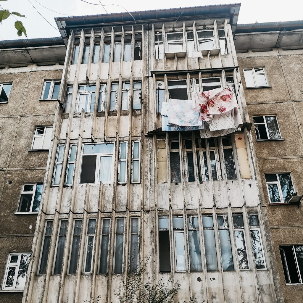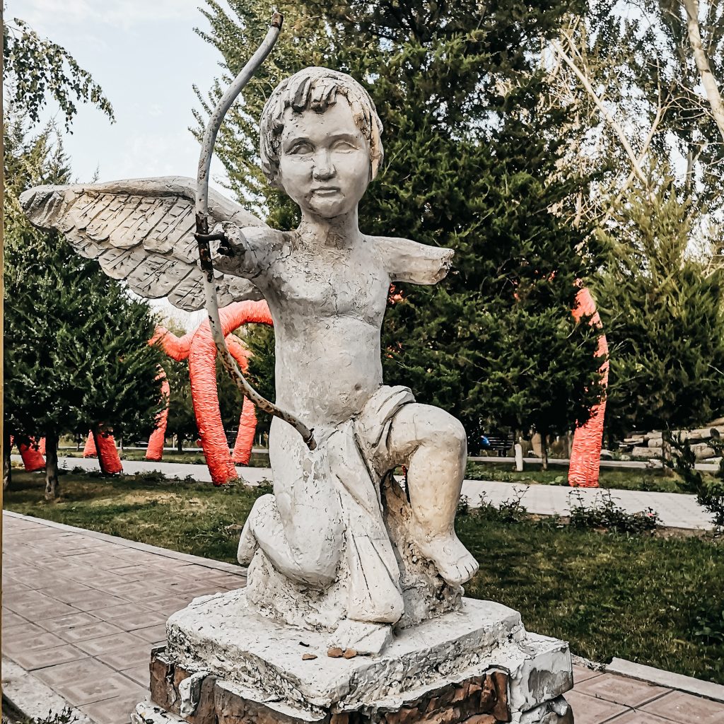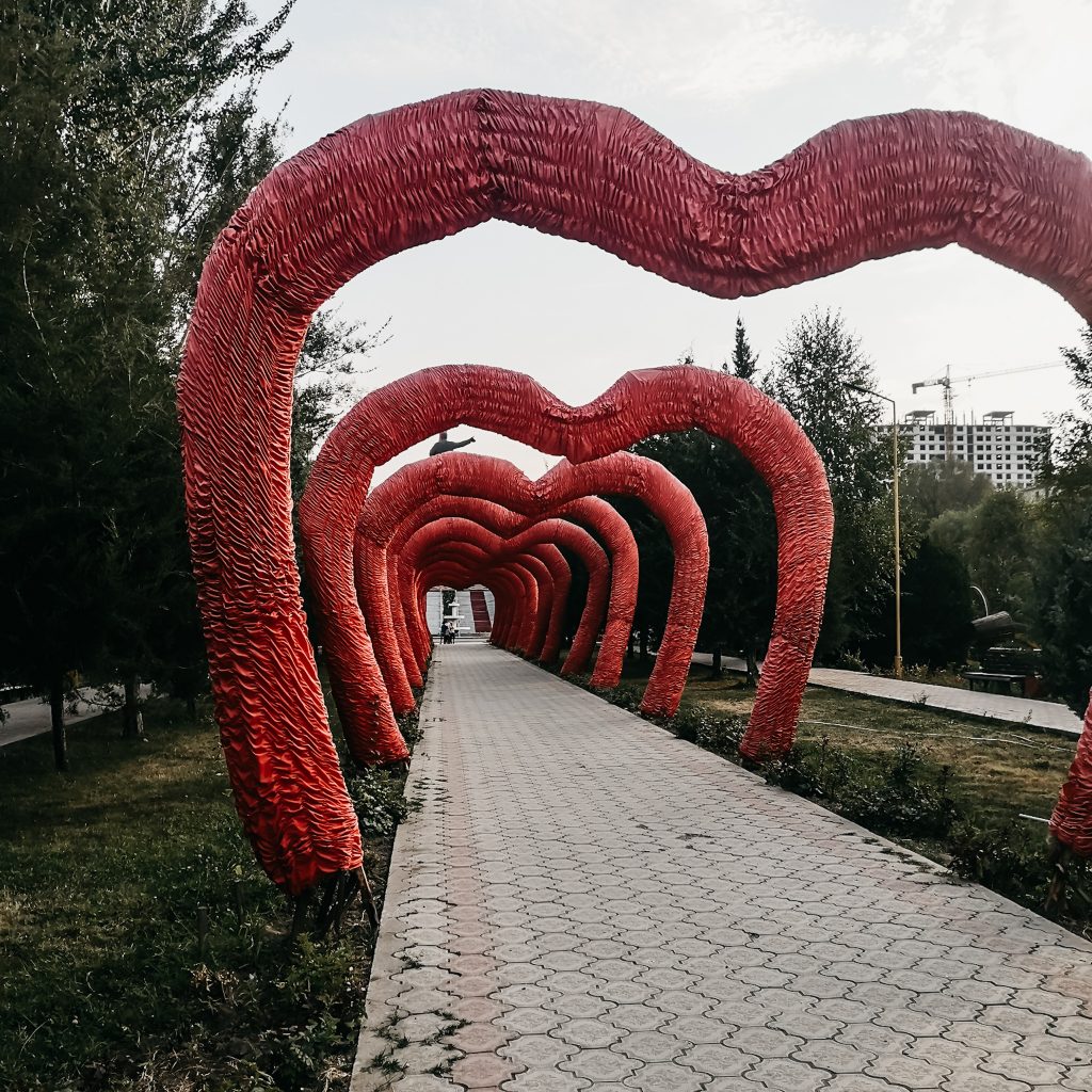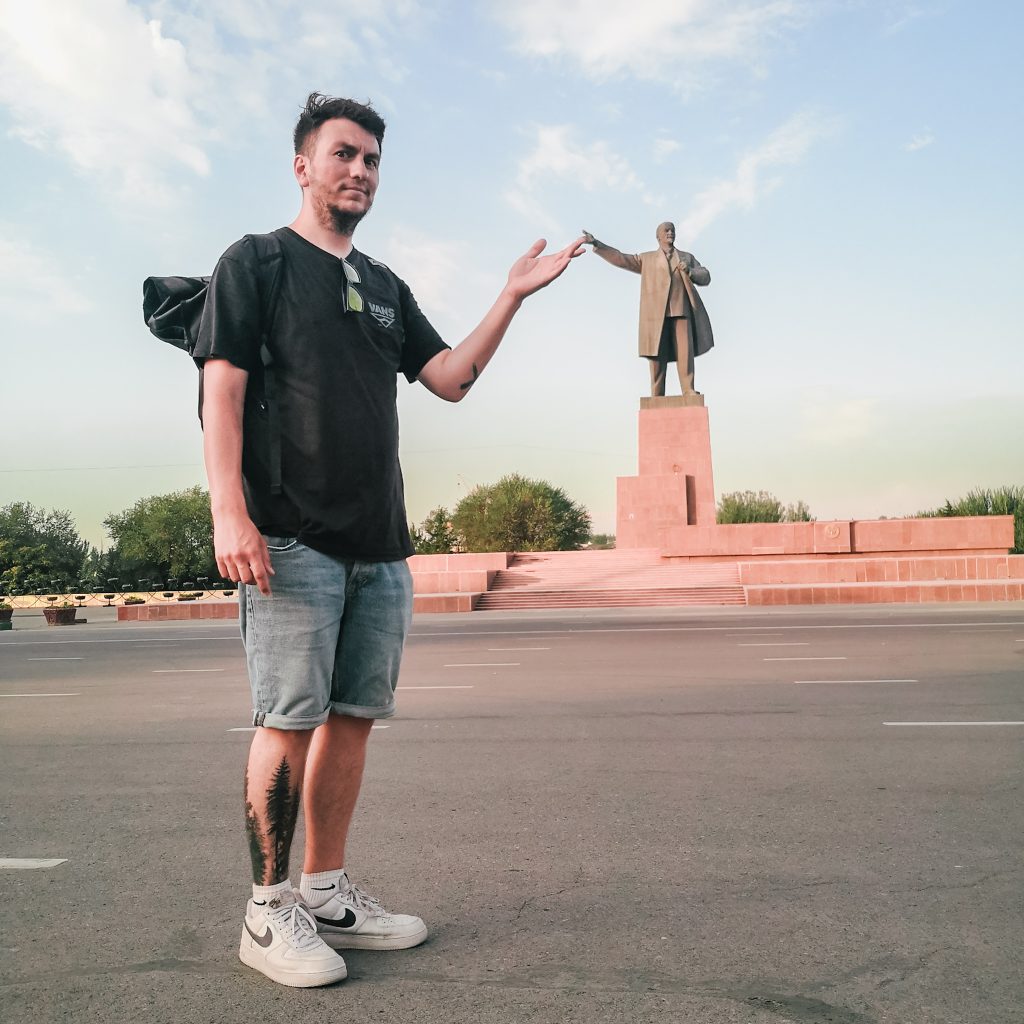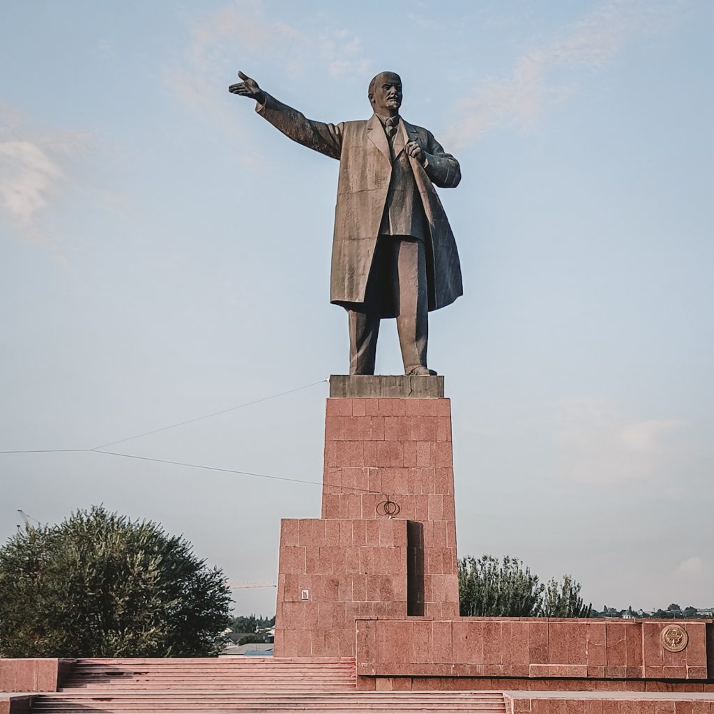 Auf dem Heimweg wollen wir noch Lenin einen Besuch abstatten. Die fast 30 Meter hohe Statue ist die höchste Lenin-Statue Zentralasiens. Auf dem Weg dorthin laufen wir an typischen Sowjet-Bauten vorbei…