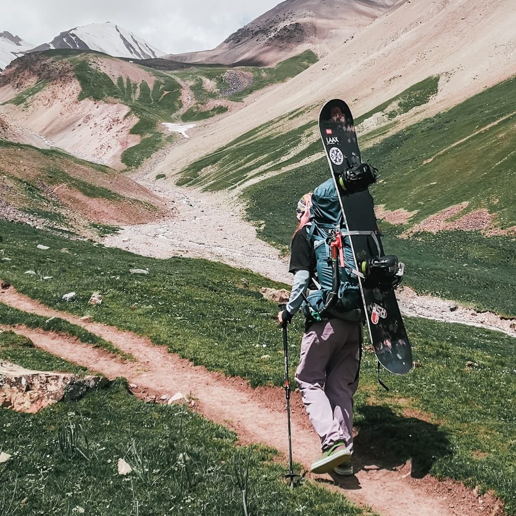 1. Sie hat ein Snowboard auf dem Rücken. Damit möchte sie vom Gipfel des Lenin Peak den Rückweg bewältigen und sie macht es nicht zum ersten Mal.