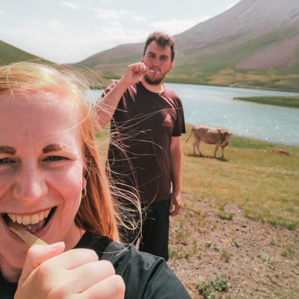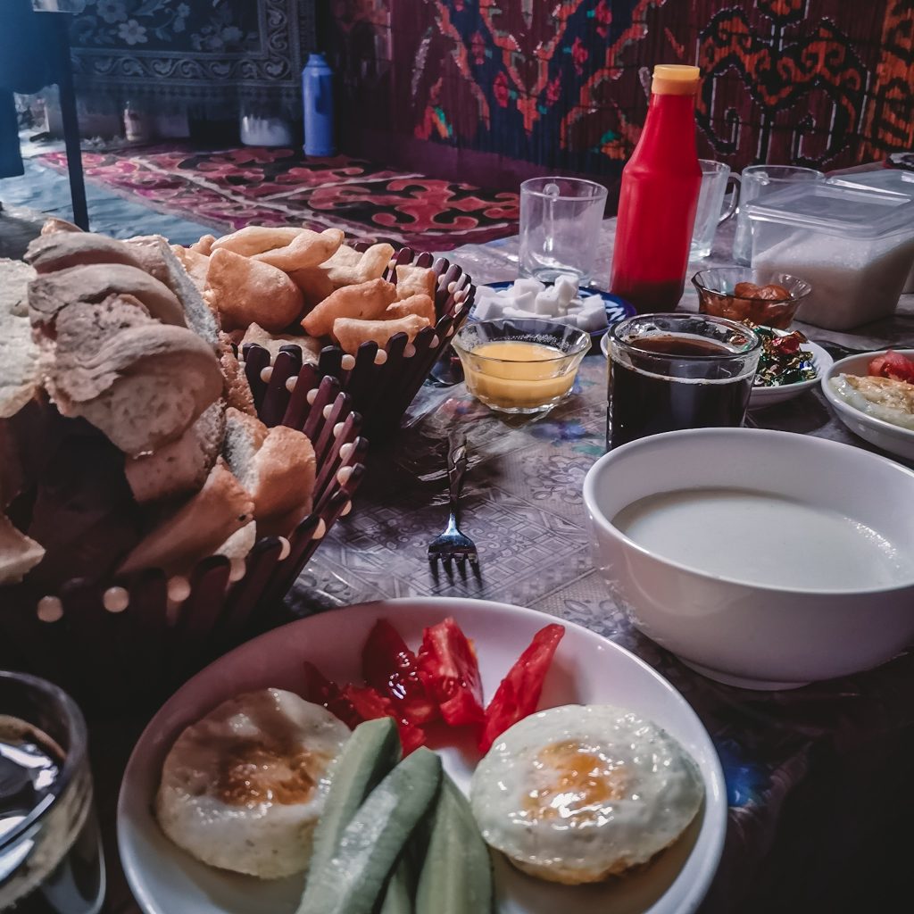 Wir sind um kurz vor 8 Uhr zurück, packen unsere Sachen und machen uns bereit für den Tag. Eigentlich wollen wir direkt nach dem Frühstück den Heimweg nach Sary Mogul antreten. Pünktlich wie wir sind, nehmen wir um 8 Uhr in der Gemeinschaftsjurte Platz. Außer uns hat es allerdings noch niemand aus dem Bett geschafft. Uns werden Spiegeleier, Gurke, Tomate, Brot und eine Art Grießbrei serviert. Als wir fertig sind, tauchen zuerst Marta und Victor und dann auch irgendwann Lisa auf. Wir verquatschen uns wieder und verabschieden uns dann (schweren Herzens) um 10.30 Uhr und machen uns auf den Weg. Nach unseren Gesprächen mit den anderen nehmen wir auf jeden Fall ein paar gute Vorsätze mit: