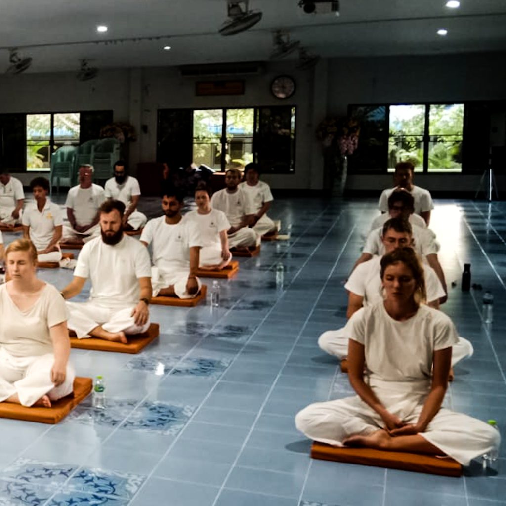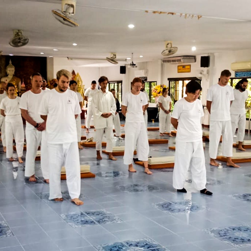 Jetzt begeben wir uns erstmal in die erste Meditation. Wir nehmen eine „bequeme“ Sitzposition im Schneidersitz ein und können die Hände entweder auf die Knie oder in unseren Schoß legen. Dann schließen wir die Augen und werden zu Beginn noch von KK angeleitet. Wir sollen uns auf unsere Atmung konzentrieren. Sollten die Gedanken abschweifen, sollen wir sie „zurückholen“ und uns wieder auf uns und den Atem konzentrieren. Gar nicht so einfach, denn unsere Gedanken schweifen ziemlich oft ziemlich schnell ab. Das ganze dauert 25 Minuten und als wir die Augen wieder öffnen, fühlen wir uns leicht wie in Trance. Irgendwie haben wir zwischendurch vollkommen das Zeitgefühl verloren. Oder haben wir doch geschlafen? Nun folgt eine bewegte Meditation. Wir sollen ganz langsam aufstehen und uns in Reih und Glied aufstellen. Im folgenden sollen wir jeweils drei Mal wiederholen, was KK sagt: „Staaaaanding. Staaaaanding. Staaaaanding.“ und darauffolgend auch dreimal wiederholt „Iiiiiiiiiiiintending to walk. Iiiiiiiiiiiintending to walk. Iiiiiiiiiiiintending to walk.“. Dann kann es losgehen. Jeder Schritt wird genau und in Zeitlupe vor den anderen Fuß gesetzt. Wir machen kleine und bedachte Schritte, dazu sprechen wir alle laut „Riiiiigh-ttttttt.“ – „Leeeef-tttttt.“ – „Riiiiigh-tttttt.“ – „Leeeef-ttttt.“ und so weiter. Selbst die Umkehr erfolgt nach dreifacher lauter Ansage. Ihr könnt es euch nicht vorstellen und denkt, dass wir vielleicht in einer kleinen Hirnwäsche-Anstalt gelandet sind? So wie wir roboterartig in unseren weißen Roben alle, mehr oder weniger einheitlich, mitmachen, könnte man das tatsächlich meinen. Für uns herrscht natürlich Handyverbot aber KK und sein Gehilfe und Freund machen ein paar Fotos und Videoaufnahmen, hier also der Beweis und ein erster Eindruck: