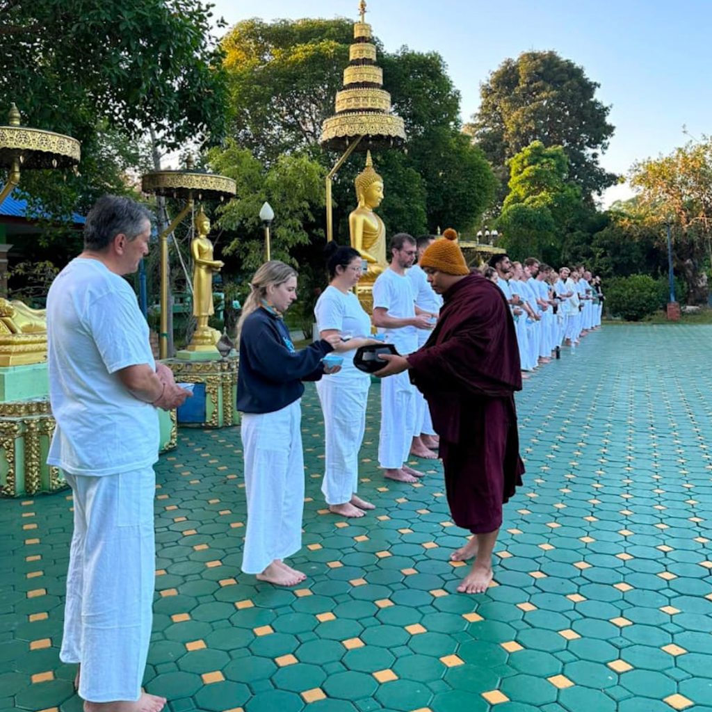 Trotz unserer Bedenken so früh vom Gong wach zu werden und sich keinen Handywecker zu stellen, sind wir sofort wach. Draußen ist es noch dunkel. Wir duschen kurz und begeben uns dann in weißer Robe nach unten, alles ganz langsam und bewusst. Wir trinken einen Kaffee und dann ertönt der Gong zur Morgenmeditation. Dieses Mal meditieren wir fast 45 Minuten im Sitzen und dann folgt nochmal eine „Geh-Lektion“ mit anderen Schritten. Noch langsamer, noch achtsamer und noch bewusster sollen wir unsere Füße heben, bewegen und von vorne nach hinten absetzen. Selbstverständlich begleitet von den gemeinsam gesprochenen Wörtern. Danach folgt der symbolische Almosengang, den wir bereits in Laos kennengelernt haben. Dafür gehen wir alle einmal durch den Essensraum und jeder nimmt sich am Buffet eine kleine Schale, in die bereits etwas Reis und ein Löffel gefüllt ist. Damit gehen wir dann nach draußen auf den Platz und stellen uns in eine Reihe. Wie es der Brauch dann vorsieht, geht KK mit seiner Schale an uns vorbei und wir geben ihm unseren Reis als „Spende“ in seine Schale.