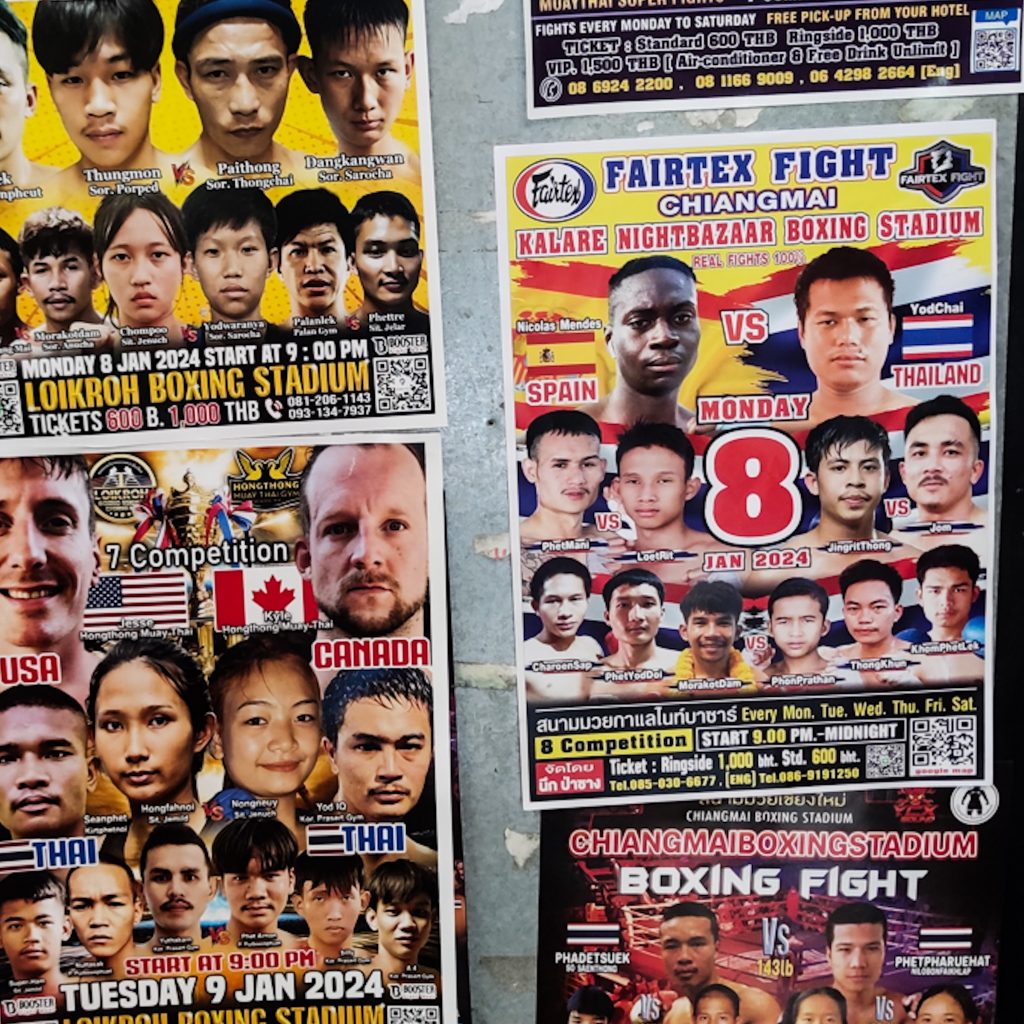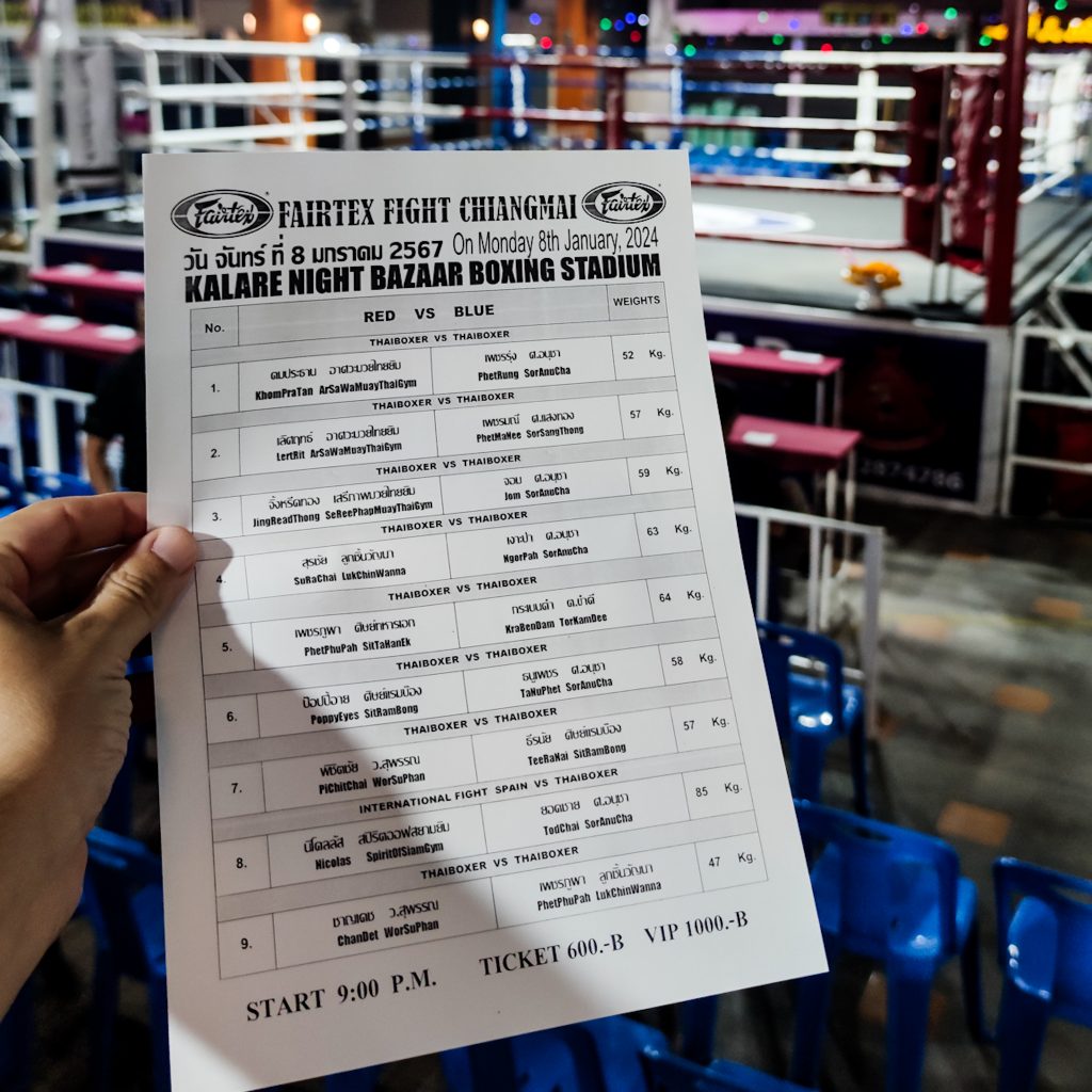 Und jetzt zu uns. Schon heute morgen haben wir kleine Werbeplakate für Muay Thai Kämpfe gesehen. Während wir zu viert das Plakat unter die Lupe nehmen, werden wir von der Angestellten eines Hostels angesprochen. Sie kann uns ermäßigte Tickets für die Kämpfe anbieten. Warum eigentlich nicht? Keiner von uns hat jemals einen Kampfsport live gesehen und irgendwie gehört das hier ja auch zur Kultur. Und schwupps haben wir kurze Zeit später unser heutiges Tagesprogramm erweitert. Mit den Rollern fahren wir etwas außerhalb der Stadt zu einem weiteren großen Nachtmarkt. Mitten auf dem überdachten Teil des Nachtmarktes gibt es eine kleine Kampfarena mit einem Boxring und kleinen Mini-Tribünen. Wer sonst noch zuschaut? Natürlich Touris. Wir bekommen einen Platz zugewiesen und mit etwas Verspätung startet der erste Kampf. Direkt neben der Tribüne bereiten sich die Kämpfer auf den Kampf vor. Die Bilder auf dem Plakat hätten es uns schon vorher vermuten lassen können, aber wir sind alle sehr überrascht als wir die Kämpfer sehen. Das sind Kinder! Die Jungs sehen teilweise aus, als wenn sie zwischen 14 und 16 Jahre alt sind. Und die wollen sich gleich die Köpfe (wohlbemerkt ohne Kopfschutz) einschlagen? Ohja, genau das passiert.