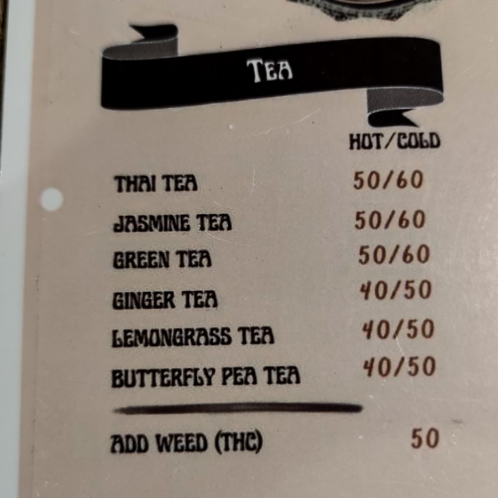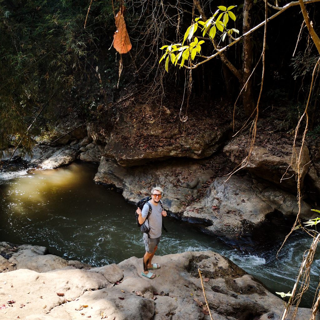 Wir setzen unsere Fahrt fort und steuern eine Empfehlung von Max an, das WTF Café. Wir landen in einem absoluten Foto-Hotspot. Das Café liegt in einem Tal zwischen den Bergen. Als Eintritt zahlen wir pro Person 100 Baht, die wir auf dem Gelände aber gegen einen Kaffee einlösen können. Das Café selbst ist mehr ein Kiosk, mit dem erstandenen Getränk sucht man sich im Anschluss einen Platz entlang des Flusses, der über das Gelände läuft. Hier gibt es sogar einen eigenen kleinen Wasserfall, der zum Café gehört. Ein kleiner Touri-Spot, aber trotzdem ist es nicht zu voll und eigentlich ganz gemütlich am Wasser. Nur essen möchten wir hier nichts, alles ist wahnsinnig teuer und die Auswahl ist auch recht übersichtlich. Daher fahren wir ein Stück zurück und halten an einem kleinen einfachen Restaurant an der Straße. Hier werden wir mit einer großen Portion Reis und Gemüse versorgt und das zu einem mehr als günstigen Preis.