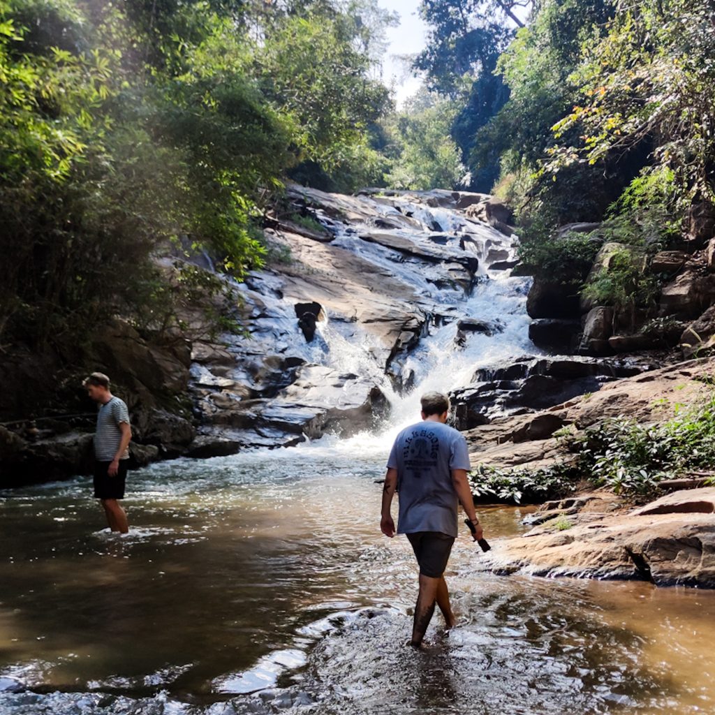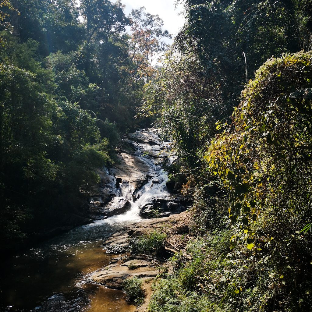 Nach dem Frühstück am nächsten Tag machen wir uns auf den Weg zum Rollerverleih, der erst um 10 Uhr öffnet. Wir holen uns die letzten Einweisungen und Tipps von Max, dem Besitzer, ab und starten dann unser heutiges Tagesprogramm: der Samoeng Loop. Zunächst müssen wir raus aus der Stadt und dem Stadtverkehr, aber kaum fahren wir in die Berge kommen wir zu unserem ersten Halt, den Mae Sa Wasserfällen. Dabei handelt es sich um 10 kleine Wasserfälle, die über Felsen und etwas kaskadenartig ins Tal laufen. Sie sind max. 10 Meter hoch und über einen kleinen Wanderweg laufen wir von unten hinauf bis zum höchstgelegenen Wasserfall. Immer wieder gibt es kleine Rastplätze, die zum Picknicken und Verweilen einladen. Entgegen unserer Erwartungen ist fast nichts los und auch die kleinen Wasserfälle sind schöner als wir es zu Beginn dachten.