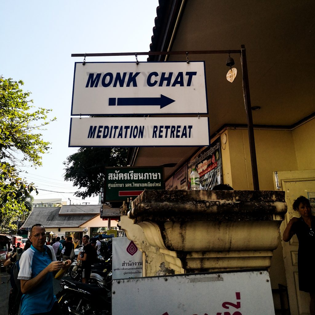 Chrissi und Flo hatten da so eine Idee: Ein zweitägiges Meditations-Retreat. Obwohl wir nicht so richtig wussten, was uns da wohl erwarten wird, warum eigentlich nicht? Im Grunde genommen sind es mehr oder weniger 24 Stunden Retreat, es geht um 13:30 Uhr los und endet am folgenden Tag um 15 Uhr. Sehr gespannt begeben wir uns zum Monk Office in Chiang Mai, hier findet die Registrierung und eine erste Theoriestunde statt.