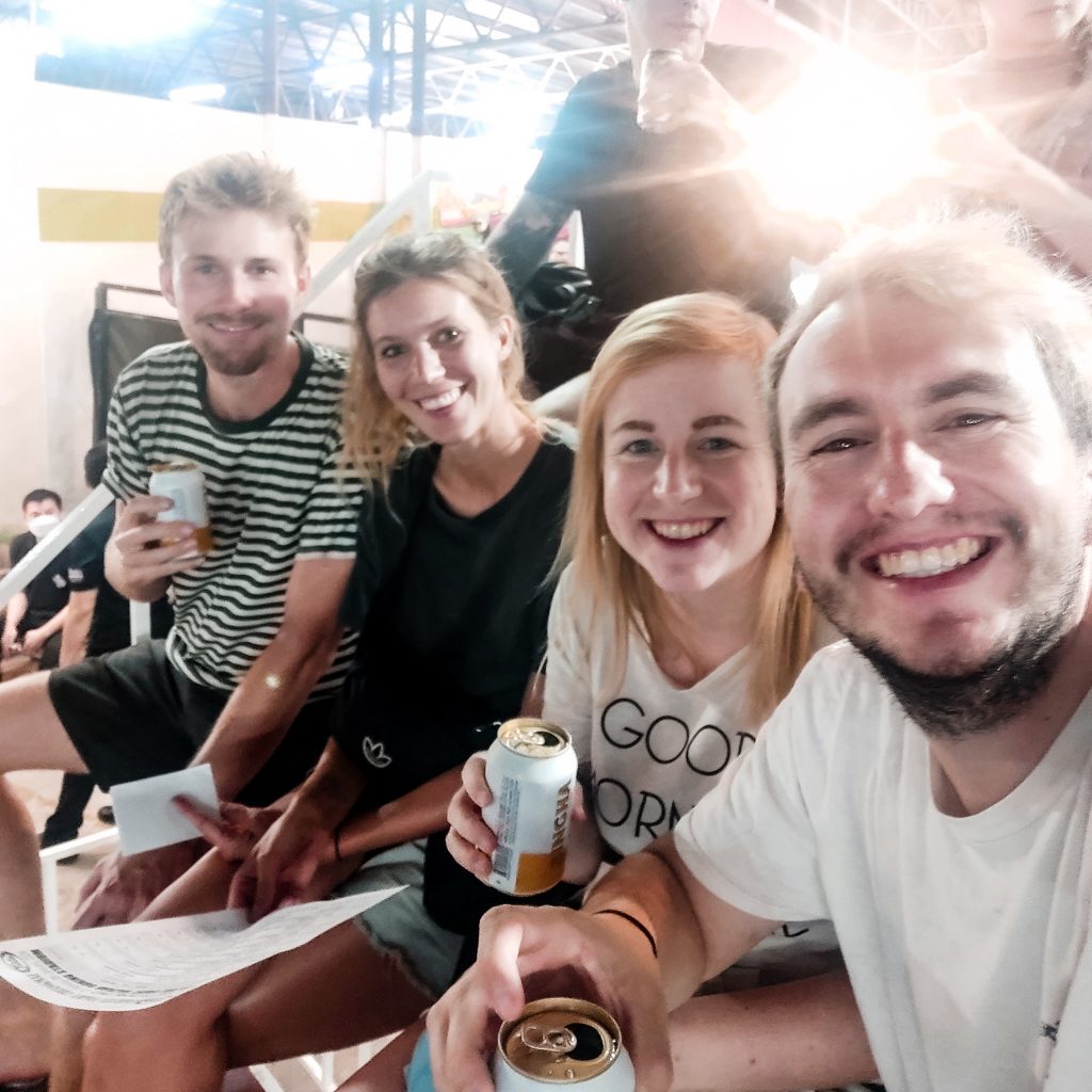 Was man aber fairer Weise dazu sagen muss: Es ist schon zu sehen, dass es kein wildes aufeinander Einschlagen ist, sondern eine Sportart mit gezielten Schlag- und Tritttechniken. Die Kämpfer gehen vor und auch nach dem Kampf sehr respektvoll miteinander um und wenn jemand K.O. geht, schauen sie direkt, ob auch alles „in Ordnung“ ist. Die meisten jedenfalls. Die Tradition wird hier groß geschrieben, zu Beginn wird die thailändische Hymne gespielt, beide Parteien begrüßen sich und scheinen mehrere Gebete und weitere traditionelle Rituale vorzunehmen. Beispielsweise gehen beide Kämpfer in jede Ecke des Boxrings und berühren mit ihren Handschuhen die Ecken. Außerdem tragen alle Kämpfer ein Kopfschmuck und bekommen zu Beginn eine Blumenkette umgelegt. Diese werden natürlich vor dem Kampf abgelegt. Wir sind irgendwie perplex, fasziniert und geschockt zugleich. Das war wirklich eine Erfahrung der anderen Art. Wir hatten ursprünglich mal überlegt, ob wir auch mal eine Probestunde für Muay Thai nehmen… Schauen wir mal 😉