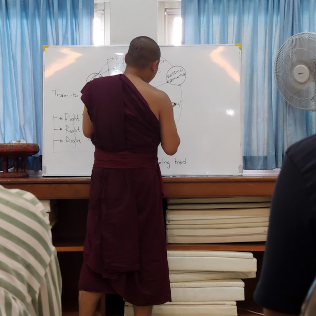 Zu Beginn werden wir mit weißen Wickelhosen ausgestattet, wer ein weißes T-Shirt ohne Aufdruck besitzt, kann dies anziehen. Konsti muss sich ein T-Shirt ohne Aufdruck kaufen, Caro kommt mit ihrem alten, nicht mehr ganz so weißen Shirt durch. Wie beige und dreckig das Shirt aber wirklich ist, fällt uns erst auf, als alle mit ihren strahlend weißen T-Shirts beisammen stehen. Oh man, vielleicht wird es doch Zeit, sich von dem dreckigen Shirt mit Flecken zu verabschieden.. Dann geht es auch schon los, mit ca. 15 anderen Menschen nehmen wir in einem Raum Platz. Wir sind eine bunt gemischte Truppe von überall auf der Welt (Brasilien, Australien, USA, Singapur, Niederlande, Schweiz und natürlich Deutschland). Was denkt ihr – nehmen mehr Frauen oder Männer an dem Retreat teil? Tatsächlich sind es Männer und auch das Alter ist vollkommen durchgemischt. Wir werden von Phra Kru KK begrüßt. „Phra“ bedeutet Mönch auf Thai und „Kru“ steht für Lehrer, KK ist dann schließlich noch sein Name. Dann begeben wir uns für ca. eine Stunde zurück in die Schulzeit, heute auf dem Lehrplan: