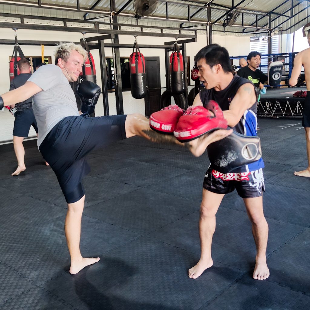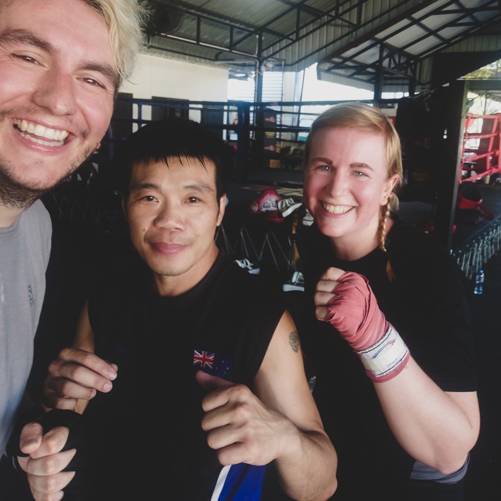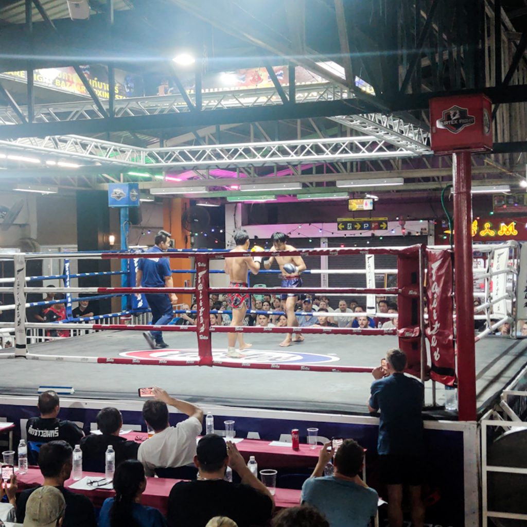 Am folgenden Tag widmen wir uns dann wieder dem Motto „Kein Thailand ohne Muay Thai“. Dieses Mal wollen wir allerdings selbst in den Ring steigen. Aber nein, keine Sorge, in den Ring steigt keiner von uns. Da fehlt noch wesentlich mehr als nur „die Fitness“. Trotzdem wollen es einfach mal ausprobieren. Online haben wir eine Einzel-Trainingsstunde gebucht, da wir befürchten, beim Gruppentraining gar nicht mithalten zu können. Als wir ankommen, sind wir (vor allen Dingen aber Caro) erstmal etwas eingeschüchtert. Es ist viel los und auf der Freifläche scheinen viele Erfahrene (meist oberkörperfrei) zu trainieren. Caro fühlt sich ungefähr so, wie im Langhantelbereich eines Fitnessstudios: unwohl. Aber nun führt kein Weg mehr dran vorbei. Da müssen wir jetzt durch. Wir wärmen uns mit den anderen Leuten gemeinsam auf, alleine das treibt unseren Puls und die Schweißproduktion in die Höhe. „Warm“ war uns sowieso schon vorher und alleine diese 5 Minuten hätten für den Muskelkater wahrscheinlich schon gereicht. Dann lernen wir unseren Lehrer kennen, ein kleiner lachender Mann. Das mit dem Lachen zieht sich übrigens durch die gesamte gemeinsame Stunde. Zugegebenermaßen: Wir liefern ihm viele Gründe dafür. Nach einer kurzen Einführung über die Schlag- und Tritttechniken, üben wir etwas am Boxsack, schieben immer wieder kleine Bauchmuskelübungen ein und schließlich geht es ans Pratzen-Training. Während Konsti am Boxsack weiter warm bleiben und üben soll, muss Caro als erstes ran. Auf Ansage sollen nun Schläge und Tritte folgen. Wir sagen euch, das ist gar nicht so einfach. Von Automatismus keine Spur und so kommt es durchaus gar nicht mal so selten vor, dass wir falsch reagieren. Sehr zur Erheiterung unseres Trainers. Wir können uns gut vorstellen, dass es für ihn sehr lustig aussehen muss. Das verlangt uns wirklich einiges ab: Konzentration, Kraft, Ausdauer und Durchhaltevermögen. Aber die Zeit geht wie im Flug um und am Ende sind wir super ausgepowert und hatten jede Menge Spaß dabei. Ein richtig cooler Sport, bei dem man mehr als nur fit werden kann. Natürlich können wir uns nicht vorstellen, wie es sein muss, wirklich in den Boxring zu steigen und zu kämpfen.