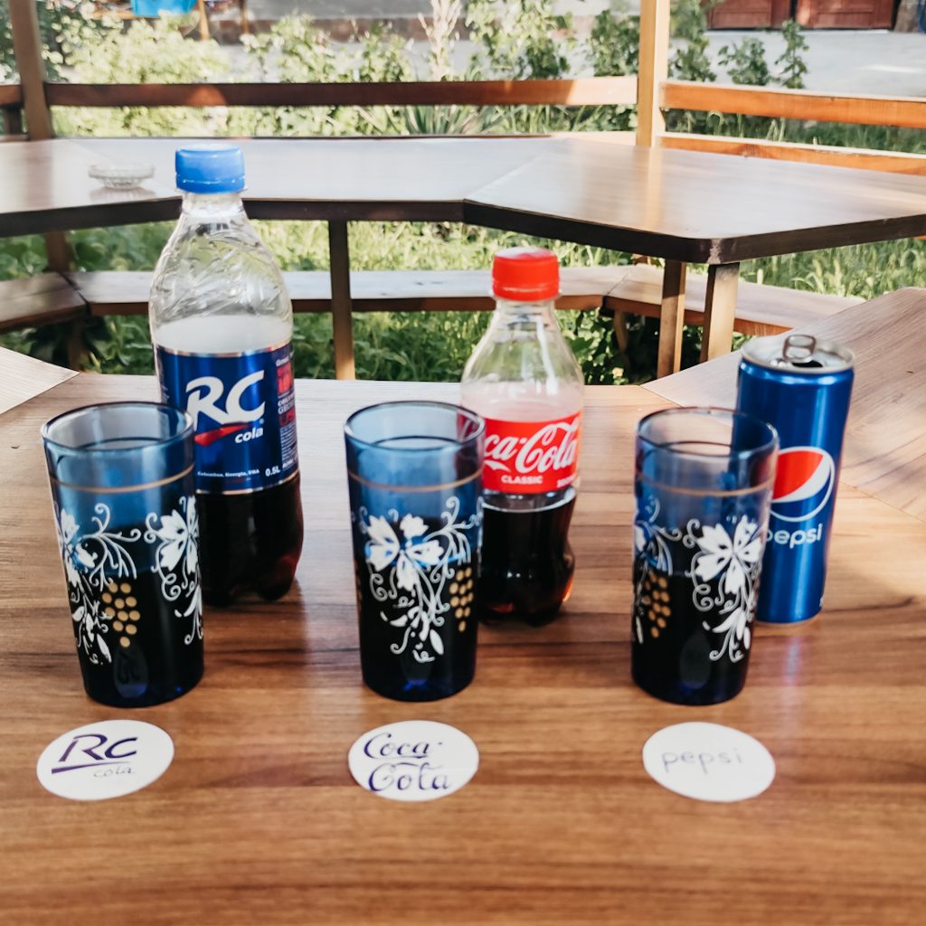 Unter absolut sterilen und einheitlichen Bedingungen starten wir den Eigenversuch. Konsti füllt drei Gläser mit einer gekühlten Kostprobe. Durch ein Foto wird die korrekte Zuordnung sichergestellt, bevor Caro sich dem Test unterzieht. Unter Begutachtung von Farbnuancen, Kohlensäure-Bläschen-Analysen, einem Geruchstest und schließlich einem stufenweise folgendem Geschmackstest, kommt Caro zu einem Entschluss. Sie ordnet die Namen den Gläschen zu und ist sich zumindest bei einer Sache ganz sicher: In der Mitte steht Coca Cola. Warum? Der Geschmack ist vertraut, die Cola weist sie meiste Kohlensäure auf und schmeckt im Vergleich am besten. Guess what. Das, was Caro EINDEUTIG als Coca Cola identifiziert, ist tatsächlich Pepsi. Lediglich die RC Cola konnte sie richtig zuordnen und geht damit lediglich mit einem Punkt ins Rennen.